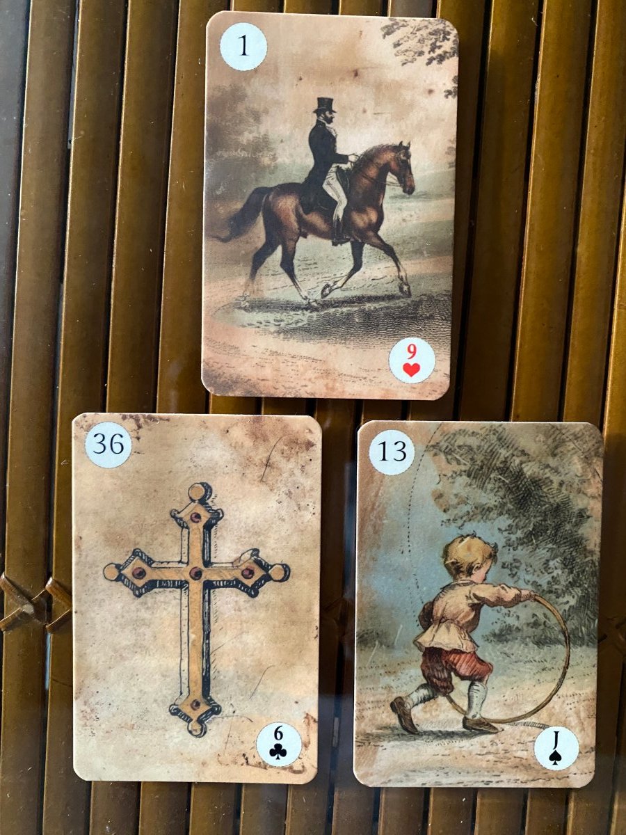 Misterei Posted May 31, 2024 Posted May 31, 2024 (edited) My 2 decks from Etsy Netherlands arrived just in time for the trip, so I brought them along. I used the Dondorf Revisited for may daily draw today [picture below]. Visually I quite like the deck, although the pure white insets are a bit jarring. A softer white would be better. I like the matte texture. The edges seem raw. They need to be finished so I think I will end up buying one of those ink pads to finish the edges. The cards are a bit hard to handle. Hopefully they will "break in". I also got a mini deck from the same vendor. It's visually similar but not exactly the same. Plan to use them together. Maybe in a GT with the large deck being Houses and mini being the spread itself. Edited May 31, 2024 by Misterei