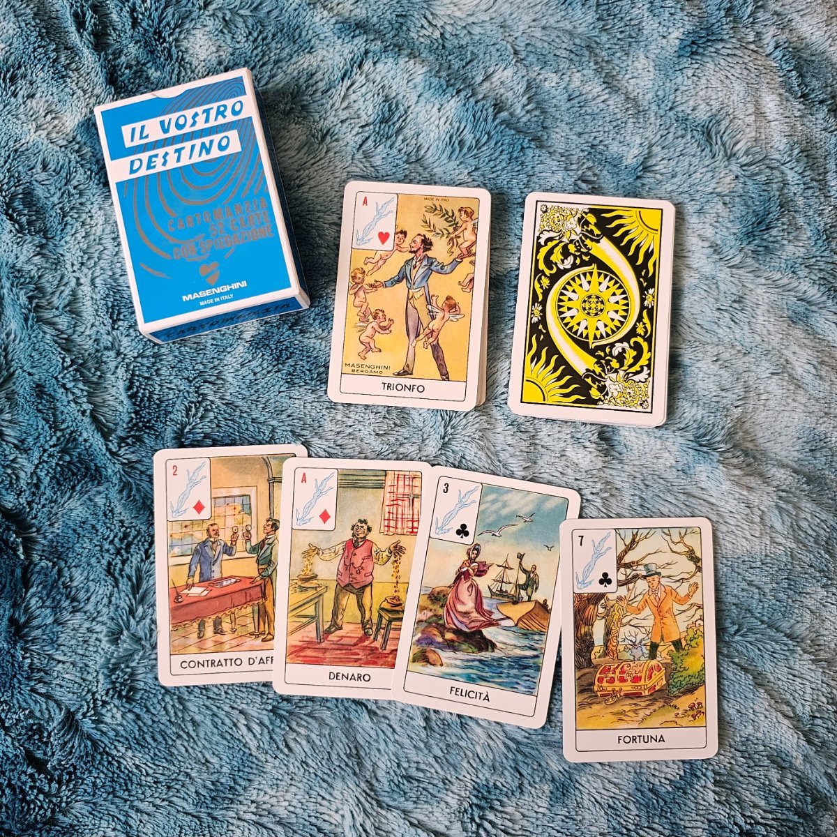 akiva Posted August 30, 2024 Posted August 30, 2024 Just received the Il Vostro Destino from the Postman today! 😁 It's a 52 card deck from the early 20th century, iirc. Some cards are similar to Sibilla (it's also a Mesenghini deck, like La Vera Sibilla), but it's different, and definitely has its own 'voice'. Each card has a keyword/title, definitely enough to inspire intuition imo. Which is good, as there's no meanings in the leaflet that came the deck. The only 3 things in the leaflet are the meanings for the suits, and 2 reading methods: an old french spread, and also a yes/no reading using the Aces. Both of these were common during the 19th/early 20th century The only thing I don't like are the backs! Not sure who chose yellow and black, or why? 😅