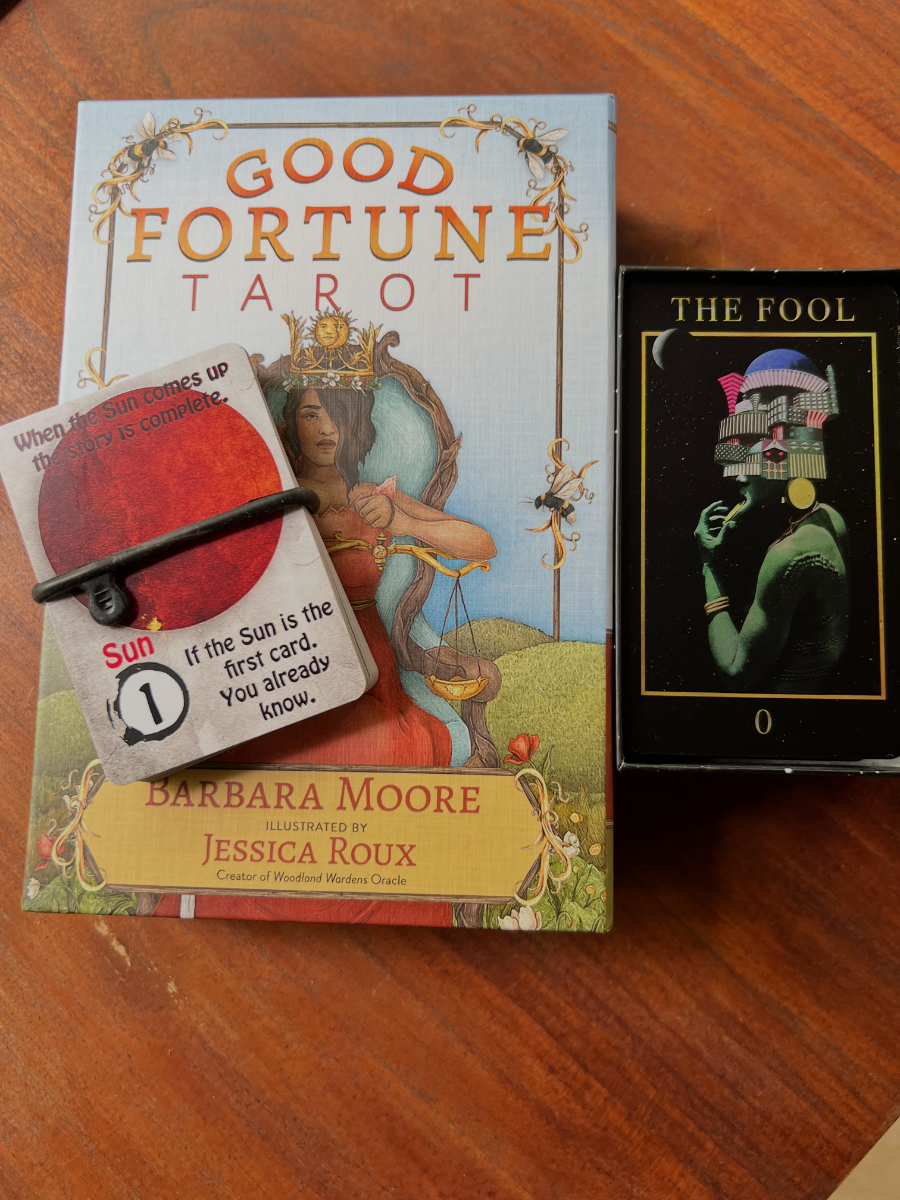 Natural Mystic Guide Posted December 17, 2024 Posted December 17, 2024 What the postman didn't bring: Brought by hand courier in personal luggage from the U.S. to Bali. When are YOU coming to Bali? Please! Good Fortune Tarot by Barbara Moore illustrated by Jessica Roux; Manzel's Tarot holographic edition; and Lenono Fortune Telling Cards, Japanese edition, by Paris Debono.