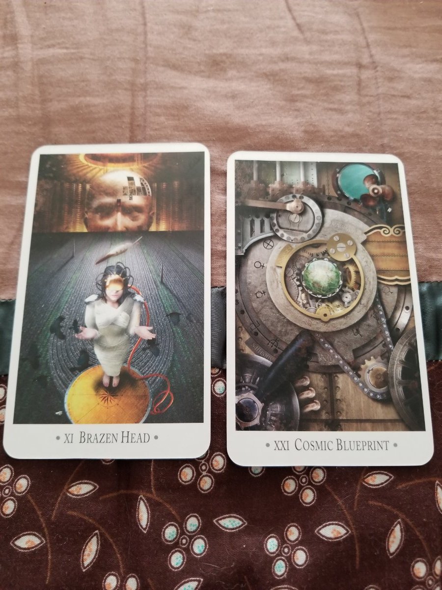 Dreamreader Posted March 26, 2023 Posted March 26, 2023 First and foremost, sorry to be late on this. But I have to admit that the Steampunk Tarot has been an intriguing deck to work with. Much as I like the traditional RWS setup for most decks, I'm even more intrigued when one decides to recontextualize everything around a deck's theme. And much as the Matthews did just that with their legendary Arthurian Tarot, so they do here. As you can see in the second pic, the Major Arcana (called "the Imperium" here) are given steampunk appropriate titles ("Brazen Head" being Justice and "Cosmic Blueprint" standing in for The World). Suites are Submersibles (Cups), Engines (Wands), Airships (Swords) and Leviathans (Pentacles). As the late 20th Century cliche goes, but wait, there's more! In addition to the usual custom spreads in the back, each Imperium card ALSO contains its own spread structured around the card's theme. So I'm thinking next week, I may go through each of these 21 additional spreads in order.