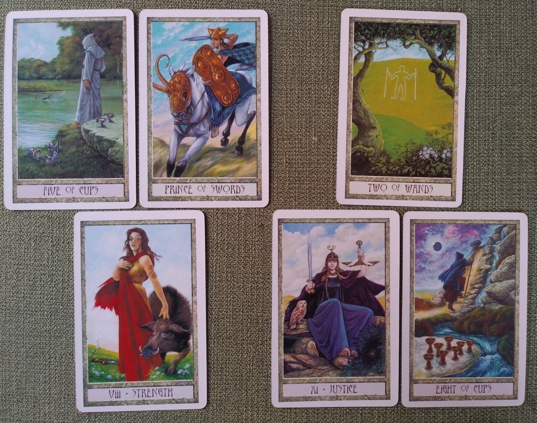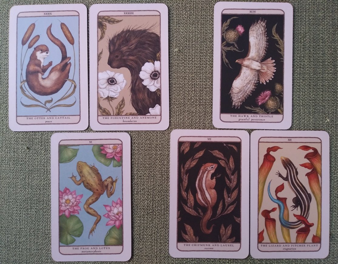 Rachelcat Posted March 18, 2023 Posted March 18, 2023 Hi, all and fire cat! Darn it. I deleted my intro. So, long story short, this week will be Woodland Wardens Oracle and DruidCraft Tarot. Let’s do separate interviews. Most important characteristic: Frog and Lotus, metamorphosis This deck is all about change. A frog makes an almost 100 percent change from tadpole. Lotus is more metaphorical: it changes from roots in mud to a beautiful flower above the surface of the pond. Plus they live together in a pond. Strength: Porcupine and Anemone, boundaries A porcupine has well-defined boundaries! Not sure about anemone. I’ll have to read up on that. Anemone closes up its petals in a storm to protect itself. The deck teaches about boundaries, and also has good definition on the differences between cards, which I appreciate. Weakness: Otter and Cattail, peace How is peace a weakness? Also my favorite, otter, in a negative position! Otters and cattails hang out in peaceful marshes, not fast moving water. The deck doesn’t have a lot to say about peacefulness. It’s more about change and conflict? What deck can teach me: Lizard and Pitcher Plant, stagnation It can teach me the risks and rewards of staying the same instead of changing. How can I learn it: Chipmunk and Laurel, success Laurel for victory! Not sure about chipmunk. I should go in whichever direction, staying the same or changing, that are the best for me. Outcome of our work together: Hawk and Thistle, graceful persistence First two-word keyword. Hawks and thistles are definitely survivors. They stay where they need to be even when a lot is done to get rid of them. I will continue to use the deck long after this week is over. It is beautiful and helpful. Most important characteristic: Strength There’s not doubt this is a powerful deck. And it’s had a strong influence on modern tarot. She’s dropped her sword to tame the beast with her bare hands. Strength: Prince of Swords He looks like a fairy to me. Or maybe he just wants us to think he is by wearing that helmet and horse’s helmet. (I have an issue: The shield is based on a real one from the pre-Roman era. But it’s obvious it wasn’t meant for carrying on a horse; definitely a foot soldier item. But maybe the prince has picked up whatever was at hand when he rushed into battle!) The strength of the deck is it goes long on Celtic culture. There’s a lot of thought behind it, but that doesn’t stop it from being forceful. Weakness: Five of Cups He’s going through a bad time, but the salmon of wisdom can jump for him out of it. The weakness is that it’s too RWS in some places? What deck can teach me: Eight of Cups It can teach me to really let go. And move on to higher things. How can I learn it: Justice Strength and Justice together again! We have the sword and scales, but also a spider, and owl of wisdom, and a feather to weigh our hearts against. I can learn to let go because when I realize it’s the right thing to do, and what’s right and wrong in the situation. Outcome of our work together: Two of Wands I will be able to put what I learn with it into action. Well, we’ll see about all this. I look forward to learning with the decks this week.