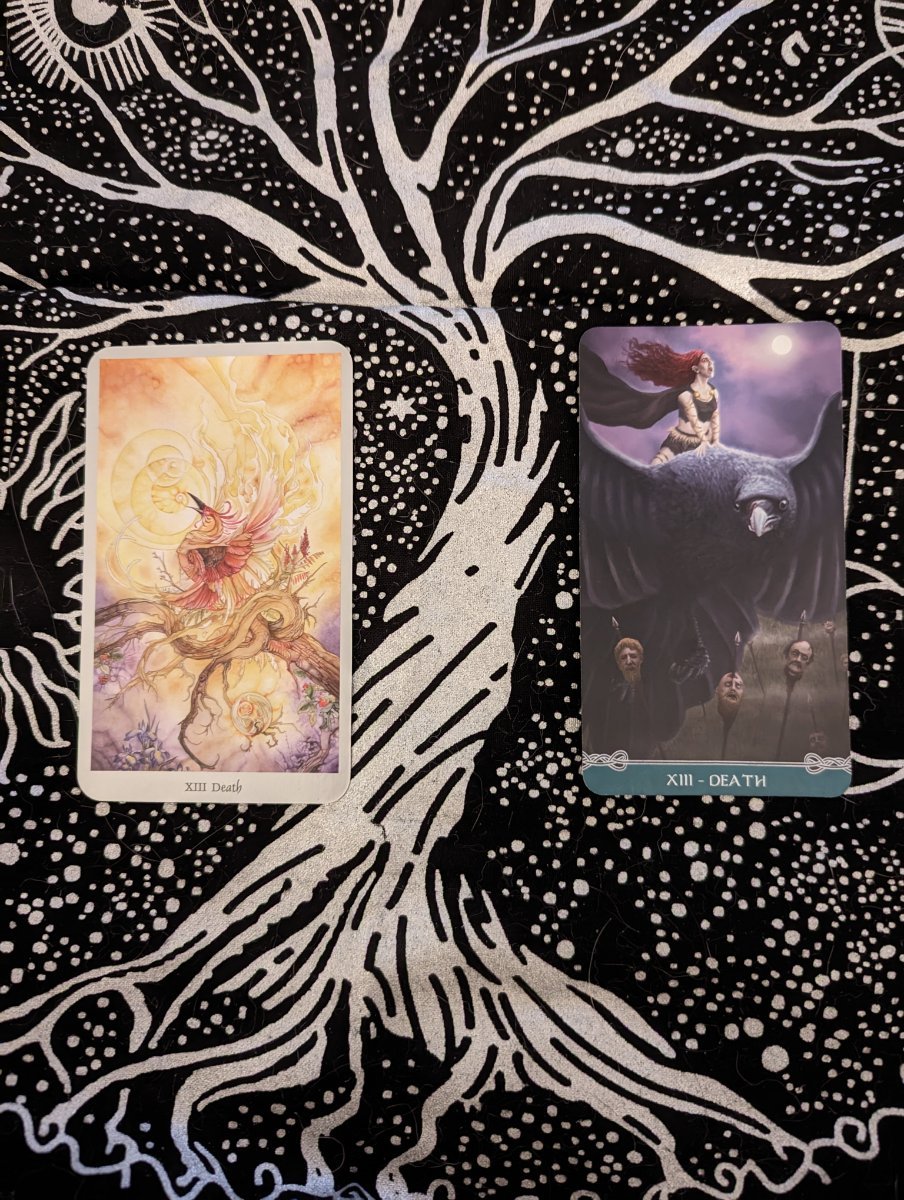 Mikhalia Posted March 27, 2023 Author Posted March 27, 2023 (edited) 3 hours ago, Chariot said: Personally, I would love to see the Death card depicted less often as a grim reaper or skeleton figure, trampling over corpses. Occasionally a deck does a different kind of depiction, and does it fairly well. It's not the concept of final endings that scares people, it's Death that scares people. There are many many decks that do not depict it as a reaper. I think one of my favorite ones that has actually made Death look beautiful is Shadowscapes. I decided to look through the four decks I had sitting next to me and found out of four decks I had two that were not reapers. The other two decks were RWS and Thoth LOL. I added a picture of the two for you. Maybe suggest a different deck if you have another student with issues about the Death card. Thankfully, there are still a lot of decks out there that stick to the basic symbols used by TdM, Thoth or RWS so despite not having certain things painted they still convey the base meanings. Speaking from personal experience I almost never learned how to read tarot, my very first deck and I did not agree. I just saw absolutely nothing in it, sadly to this day I still see nothing when I try and use the same deck. The left side is Shadowscapes which has taken any symbolism of death out but still implies it by using the Pheonix and the right side is Universal Celtic deck which while still, a dark card does not evoke the same feelings the scythe-wielding skeleton would. Edited March 27, 2023 by Mikhalia