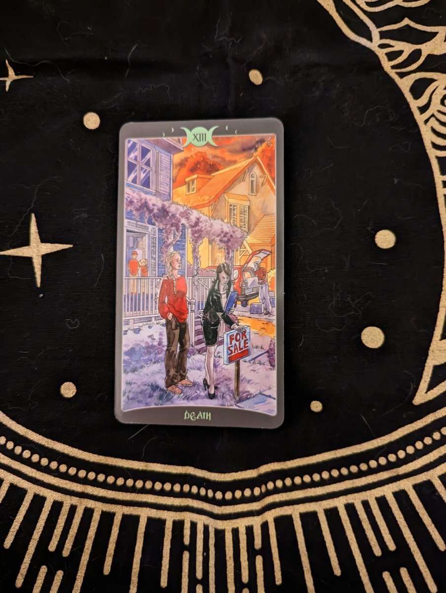 Chariot Posted March 27, 2023 Posted March 27, 2023 (edited) 52 minutes ago, Mikhalia said: I looked through my collection and did not have any trash bins but I did find one that portrays both aspects in a more modern setting (the man with boxes who knows those could be things he intends to throw away). This is the So Below side of Barbara Moore's As Above So Below deck. It shows them putting their house up for sale and their house is all gloomy and sad looking but next door the neighbor's house is the red of rebirth with him loading the back with boxes. I would prefer to keep a darker theme as well because that change is never easy and the querent needs to know this too. Thank you for sharing! I love the Day of the Dead tarot 🙂 I JUST found and ordered this deck, the So Below deck, just before I saw your post. Yes. While I'm not enamoured of the artwork in this deck, that's exactly the kind of image I would like to be able to use for the Death card in certain circumstances. Exactly. Thanks for sharing that. I await the arrival of my deck with a great deal of excitement. Just checked out The Housewives Tarot, @AmnisArtis - and I must say I love the concept of the jar of spoiled mayonnaise. Yep. Definitely reached the end of its life a while ago, and needs to be thrown away. I'm not terribly fond of the deck as a whole, but I really like the idea of that image. I have the Robin Wood tarot, and while yes, the red-cloaked figure of Death is a bit less scary than the usual black reaper, it's still a 'reaper' and when the card is labeled Death, I think people who are scared of the image will still see it as 'death of a person.' I'm not familiar at all with The Vanessa Tarot ...I'll need to look that up. Thanks for the suggestions. 🙂 Edited March 27, 2023 by Chariot