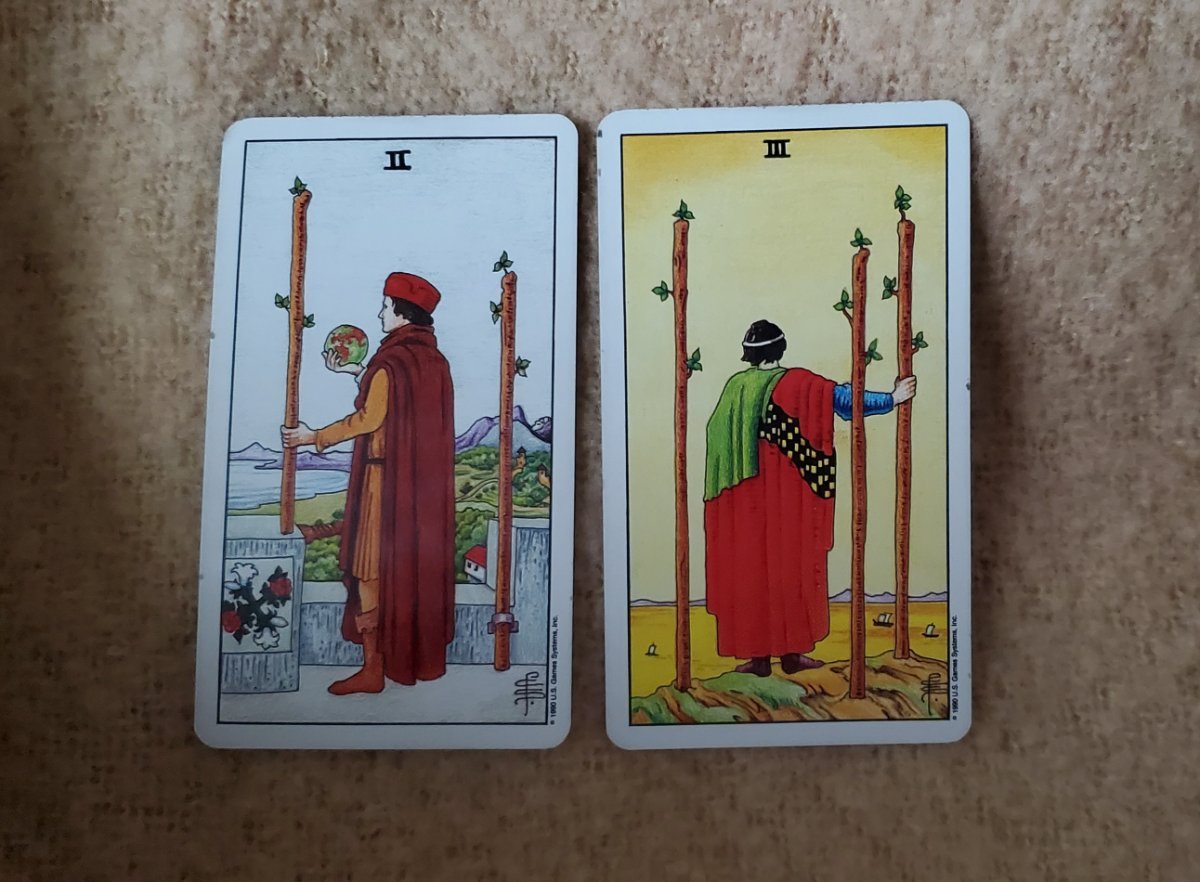Strength8 Posted March 24, 2023 Posted March 24, 2023 (edited) Hi, How do you differentiate between these two in your readings? Or how have they shown up or panned out in your readings? Both are holding on to one wand only, so potentially one choice has been made, leaving behind one or other two. Then, I think about if two of cups is a choice or even lovers being read as a choice, then do we use these wands cards for choices too? If three of wands is waiting for results (looking at ships) or sending ships off to progress, then is two of wands about getting ready to take that one step in the vast sea? On has turned his back (I only use RWS so only speaking for that deck) and other is standing sideways but neither looking directly at the querent or reader. Two of wands guy has the World in his hand and we can't see one hand in 3 of wands card. What does that mean to you? Holding wand in left or right hand- has that been meaningful to you, if yes, in what way? Did 2 of wands guy get short stick by choice or could not "free the other one" for himself? 2 of wands seems to be in house and 3 of wands has ventured outside. Do you think 2 wands guy is younger self of querent and 3 of wands when querent be more seasoned? I understand context is everything, I am trying to learn from your experience. Please do add your thoughts, in response to any portion of this post or just your thoughts, as they come to you about these two cards (RWS). Thanks! Edited March 24, 2023 by Strength8