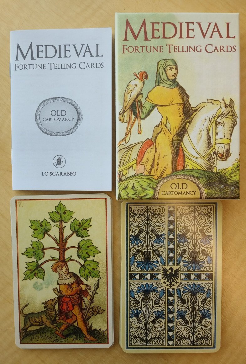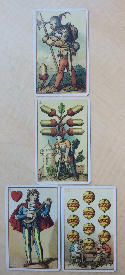 Rachelcat Posted May 24, 2023 Posted May 24, 2023 Hi everyone! I think I've got the schedule down now! For our two remaining shorter weeks, I’m going to use two playing card decks. This week is Lo Scarabeo’s Medieval Fortune Telling Cards. They’re German-suited playing cards dated circa 1880 with evidently “medieval” scenes. German-suited decks have suits of acorns (clubs, batons, wands), hearts (cups), leaves (spades, swords), and bells (diamonds, coins). Their “aces” are actually deuces (with two suit items), and the rest of the numbered cards are 6 through 10. Courts are unter, ober, and king. For a total of 36 cards. (The booklet makes the unter the ace, but that’s not the way it’s explained in Wikipedia!) In this deck, deuces feature an animal, and the rest of the cards show types of people. Acorns have a lion and depict soldiers. Hearts have lovebirds and show cupids and lovers. Leaves have a stag and hunters. Bells have a workhorse and various occupations. Not sure how well I’ll do with these, especially because there are so few women (only in the “lovers” suit)! And there are only 6 through 10. Let’s give it a try! What is your strength? 10 Bells It completes my collection of German-suited cards. It’s a good reproduction of an historical deck. What is your weakness? Ober of Hearts It’s not good for romance readings. Because it doesn’t have many women! What can I learn from you? 6 Acorns I can learn about leadership and victory. The battle has been won, and the crossbow archer is winding up to be prepared for future battles. What will be the outcome of our work together? Unter of Acorns Our work together will be serviceable but not all that exciting or helpful. A foot soldier/pikeman does his job, but he’s not the one who makes decisions about where to be deployed next. Ok, interesting! We’ll see how it goes this week!
