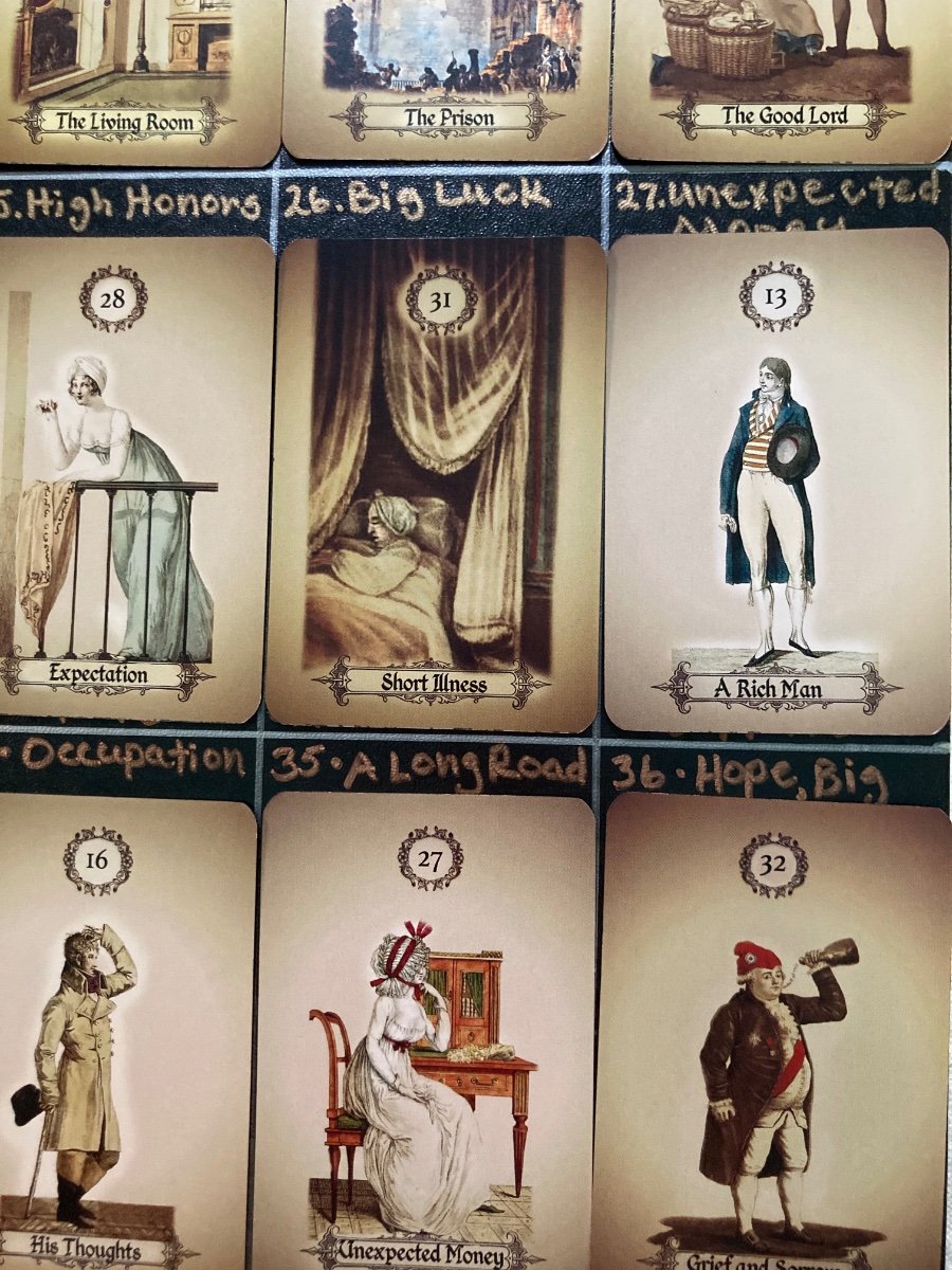 Madame Squee Posted June 19, 2023 Posted June 19, 2023 This week: Kipper Cards (Alexandre Musruck) and Flonz Victorian Lenormand (on poker chips). A few months ago, I made a chart for the Lenormand grand tableau on the back of an old game board and really enjoyed it. Then yesterday, while delving into Musruck's Kipper book, I started wondering where I would find another suitable game board for the Kipper grand tableau. And it hit me... Just turn the board 180 degrees and write the Kipper card titles on the end opposite of the Lenormand titles. 💡😁