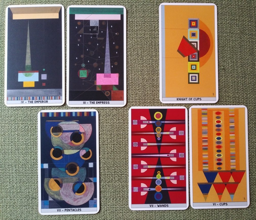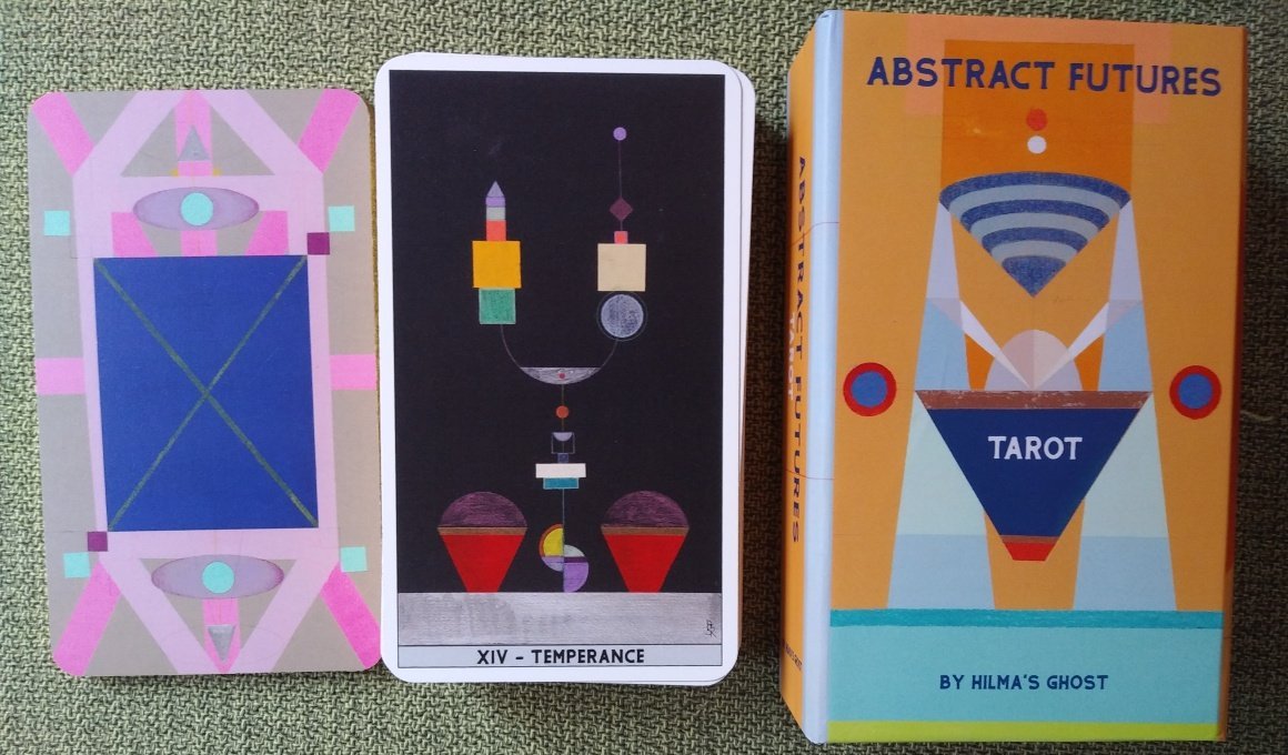 Rachelcat Posted June 19, 2023 Posted June 19, 2023 Hey there, everybody! Happy Juneteenth! Continuing with my “in the order they were received” decks, this week will be Abstract Futures Tarot by Hilma’s Ghost. It’s a tribute to artist Hilma af Klint. Wikipedia: Hilma af Klint (26 October 1862 – 21 October 1944) was a Swedish artist and mystic whose paintings are considered among the first abstract works known in Western art history. A considerable body of her work predates the first purely abstract compositions by Kandinsky, Malevich and Mondrian. She belonged to a group called “The Five,” comprising a circle of women inspired by Theosophy, who shared a belief in the importance of trying to contact the so-called “High Masters”—often by way of séances. Her paintings, which sometimes resemble diagrams, were a visual representation of complex spiritual ideas. I found it when I was researching abstract decks for my tarot society presentation on Taro as Colour, and definitely had to have it! I have no art background, but I really like geometric art, and decks, of course! (See the linked presentation for my other geometric abstract art decks.) There’s no booklet. There are short meanings, with reversals, for the cards on the website. Nice wrap-around box with ribbon. Edges are a glittery gold. (Glitter came off at first, but I think it’s done shedding now!) I’m looking forward to finding out how it reads. And on to the interview! What is your most important characteristic? VII Pentacles It was created for the love (7=Venus) of art, and making art into a physical item (pents) that anyone can own. What is your strength? Empress What is your weakness? Emperor I swear I shuffled! Comparing the two, I see the Empress is more exuberant and full, not only of items but also of movement. Emperor seems lonely and almost overwhelmed by the dark. So the deck is strong in beauty, enjoyment, and abundance. It’s weak when it’s pared down to follow the rules. What can you teach me? VI Cups Love and happiness! I’ll take it! Meta: How to appreciate emotions transmitted by abstract art. How can I learn it from you? VII Wands It will be a struggle to learn it, but I’ll enjoy the struggle! What will be the outcome of our work together? Knight of Cups I will learn the lesson (knight) about emotions (cups). I might even fall in love with the deck! Well, we’ll see about that, won’t we!