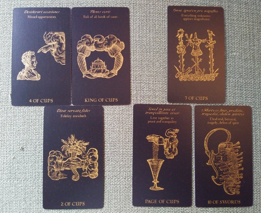 Rachelcat Posted June 26, 2023 Posted June 26, 2023 Hi, everybody! Hi, fire cat! This week for me will be Tarot Emblemata by Nitasia Roland. It has black background with gold artwork, with a linen finish. It’s based on “Renaissance emblems from the French writer and historian Claude Paradin’s emblem book Devises Heroique, published in 1551 with woodcut illustrations attributed to Bernard Salomon.” The mottos on the cards are in Latin and English translations. There are 10 extra cards, which the author calls “oracle cards.” I think of them as extra majors and will keep them in the mix. There is a separately purchased full-sized “companion guidebook” that I didn’t find very helpful and is definitely not necessary to enjoy the deck. Ok, let’s shuffle and interview! Lots of cups, no majors. What is your most important characteristic? 2 of Cups, Fidelity enricheth You either love it or hate it. It’s faithful to tarot meanings. What is your strength? King of Cups, Full of all kinds of cares Interesting take of the king of cups: he’s in charge, and he cares, so he worries. The deck cares about how I and others feel about it. Which makes it eager to please! What is your weakness? 4 of Cups, Missed opportunities He misses the hand from above. The deck misses out on other choices it could have made. It isn’t open to non-RWS meaning. What can you teach me? 10 of Swords, Dead end, betrayal, tragedy, defeat of spirit It can teach me bad things, including defeat, happens. And maybe how to deal with that. Tarot isn’t all fun and games. How can I learn it? Page of Cups, Live together in peace and tranquility By keeping an open, beginner’s heart. This cup doesn’t have a lid; it allows circumstances, or a higher power, to fill it up. What will be the outcome of our work together? 7 of Cups, Everything unknown appears magnificent Similar to the 4. Choices were made to create the deck, and I may agree or disagree with them. I don’t like it as much once I have it in hand, but it’s fun to have!