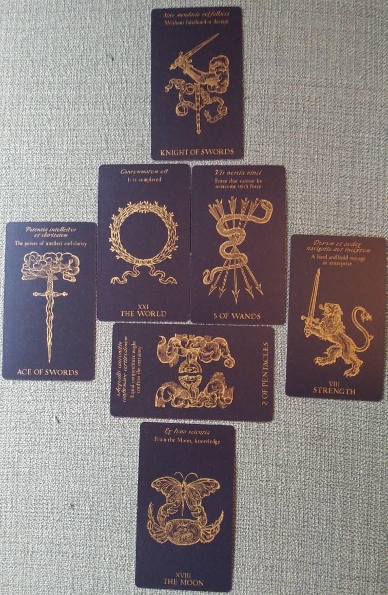 Rachelcat Posted June 27, 2023 Posted June 27, 2023 (edited) Tuesday First part of Celtic cross Significator: World, it is completed In this reading, I’m representing the whole world, an everyperson if you will. Or someone who has already accomplished everything I want to? Cover: 5 of Wands, Force that cannot be overcome with force The reading is about conflict. The arrows all point the same way, but it’s a darn snake! Someone isn’t telling the truth in this conflict. Cross: 2 of Pentacles, Equal conjuncture might confirm the certainty Conjuncture? Maybe we could have found a better word? Connection? The problem is getting people together. To get the people in the conflict to connect in the physical, reality realm. I really like the image of the friendship pendants coming together. Crown: Knight of Swords, Without falsehood or deceit My ideal, what I would like is if the connection is based on truth and unemotional facts. (Deceit is spelled wrong on the card.) Beneath: Moon, From the moon, knowledge For a long time, and now, the conflict has been based on emotion and maybe illusion. At least we get knowledge of how the opposition is thinking and feeling? I like the combination of the luna moth and crab. Behind: Ace of Swords, The power of intellect and clarity But farther in the past, people at least pretended that they cared about the truth and facts. So the past and the ideal are aligned. What about the future? Before: Strength, A hard and bold voyage or enterprise Here’s another sword. To win the conflict, for everyone’s benefit, we have to wield the sword of truth with strength and boldness. We can’t give in to the illusions of moon. Usually the sword goes with Justice instead of Strength, so this might be a subtle nod to the Justice-Strength switch. Or maybe it’s just a cool lion illustration . . . I read this as very general, and as more of a mundane reading, because the first card is the World. I’ll think about if it is specifically aimed at me personally. Edited June 27, 2023 by Rachelcat