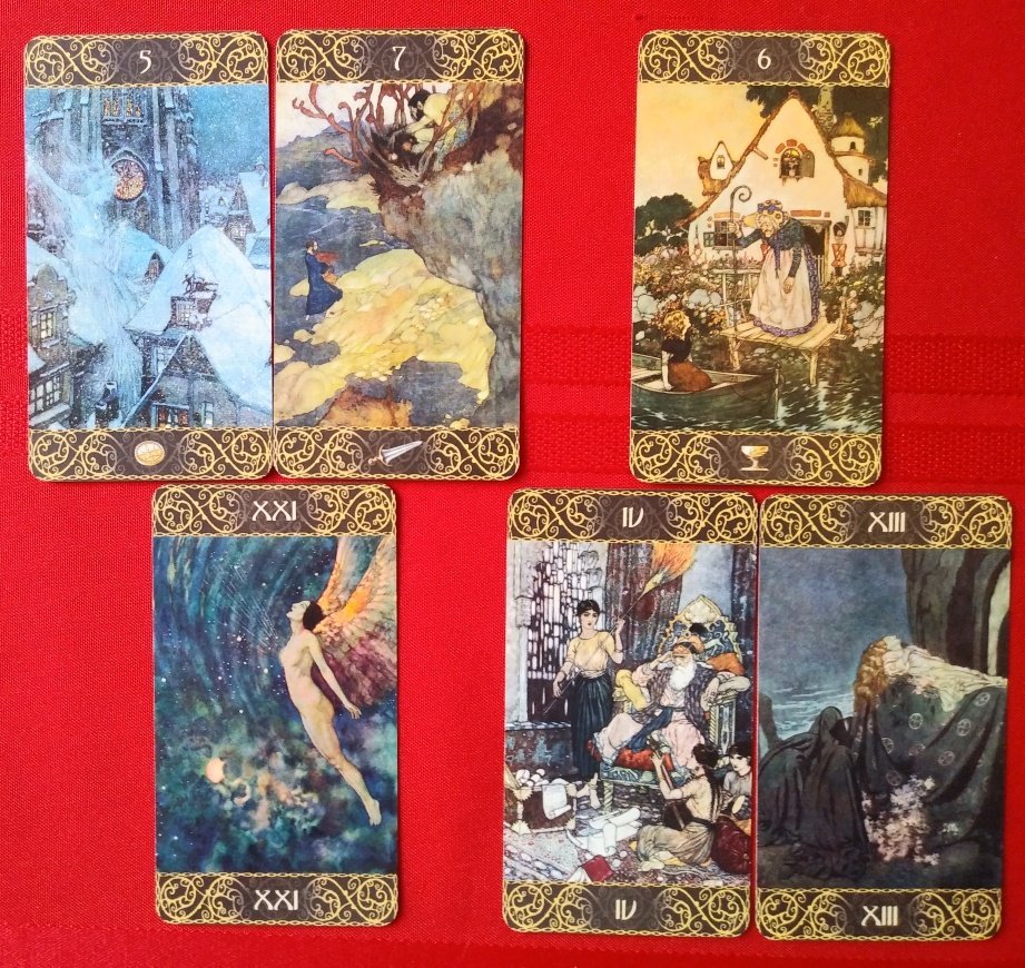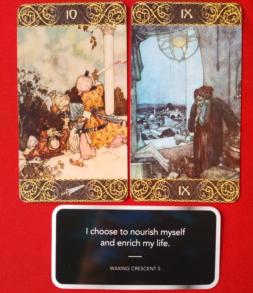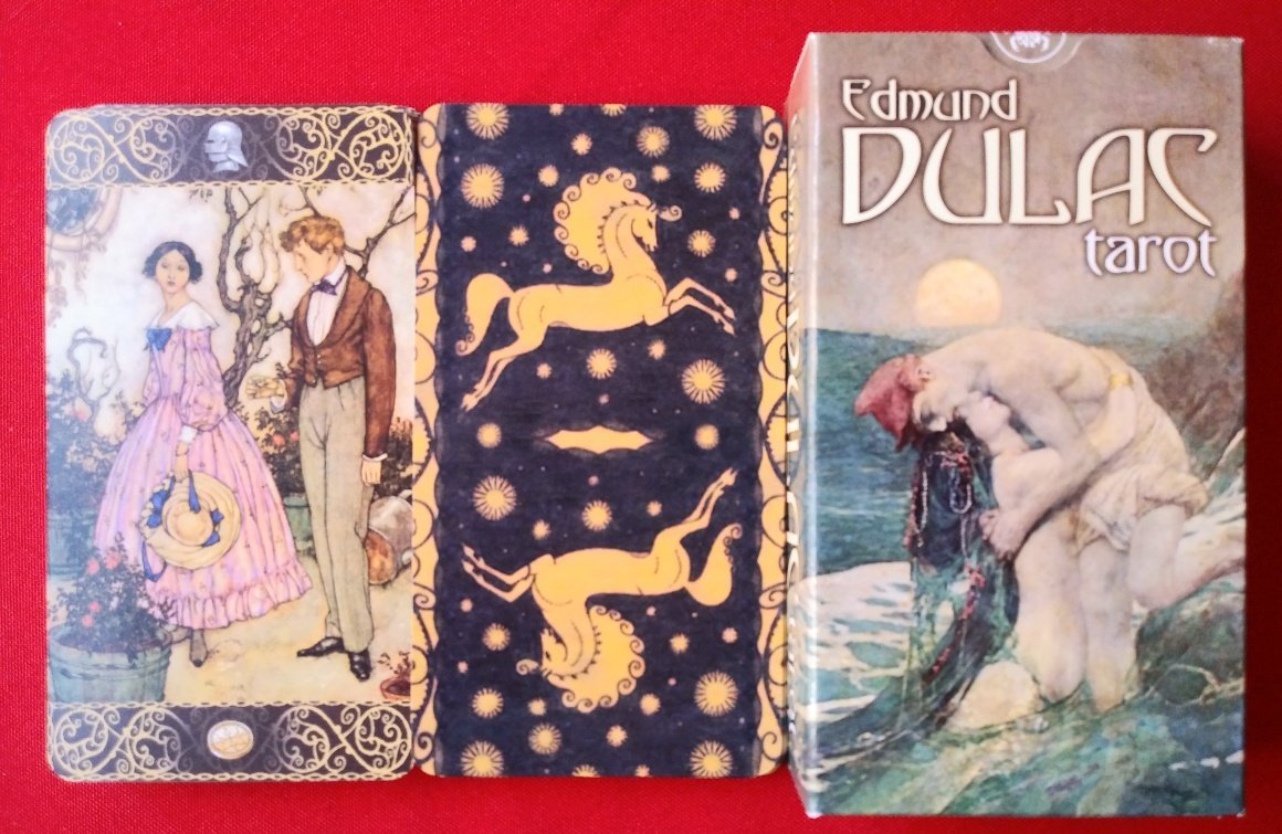 Rachelcat Posted August 21, 2023 Posted August 21, 2023 Hi crew! Good to be starting a new week and good to see you here! Monday on Sunday This week will be Edmund Dulac Tarot. A while ago I topped up my golden age of illustration -based decks, and I’ll be using my new ones for the next few weeks. This one might be my favorite so far. Dulac lived in France and England 1882-1953 and illustrated many books, including those by the Brontës, Poe, Hawthorne, Stevenson, and Yeats and many others. Let’s move on to the interview and then today’s Moon Magick affirmation. For some reason, I totally read this spread backwards. But that seemed to work! What is your most important characteristic? World Everything! The deck shows everything as beautiful, colorful, ethereal, and full of heart. What is your strength? 7 Swords It can reveal deception and what is hidden. The ogre is hidden from the traveler, but the viewer can see it. What is your weakness? 5 Coins Because it’s a fairytale deck, it doesn’t really show true-to-life troubles and problems. Fairytale problems are either glossed over or much more horrendous. This is a beautiful snow scene with a beautiful church rather than a depiction of the people being shut out. But are there people on the roof. What are they doing? What can I learn from you? Death I seem to be getting Death a lot recently . . . Endings and letting go can be beautiful even if sad. Depending on whether what was needful was accomplished. How can I learn it? Emperor The thing I need to learn about Death is that I can end (and begin) anything I want to at any time. I’m in charge of what I want my life to be and what I want to include and leave out, or take out. What will be the outcome of our work together? 6 Cups There will be mutual admiration! I’ll receive the good vibes of the deck in a childlike and positive way. Waxing Crescent 5: I choose to nourish myself and enrich my life. Well, these are both unexpected and challenging! What can I do with them? How should I nourish myself? 10 Swords I should be extreme! I should come up with some weird intellectual plan for nutrition, and then follow it through, even if other people think it’s extreme. I don’t know about this. I’m usually pretty practical when it comes to food, but we’ll see. How do I enrich my life? Hermit I can enrich my life by spending more time not really by myself but with my own thoughts instead of constantly consuming information from others. He’s got his book and his equipment, but he’s coming up with his own ideas from his own observations of the town from above.