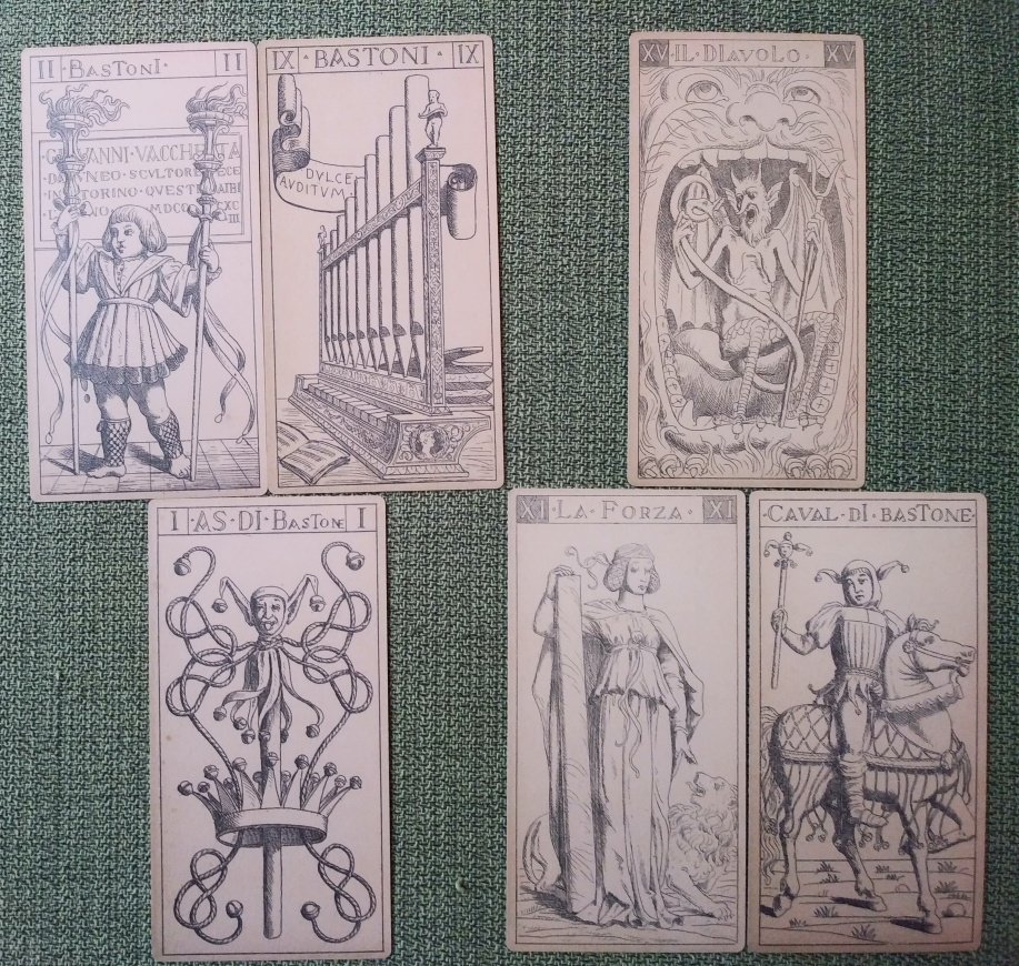 Rachelcat Posted September 18, 2023 Posted September 18, 2023 Monday on Sunday Hi, everyone! Another week, another deck! This week will be Lo Scarabeo Anima Antiqua Naibi di Giovanni Vacchetta Torino 1893. I have two other versions that are colorized, the LS with green borders and muted colors, and the Il Meneghello with brighter colors. This one is a photo repro in black on sepia. It has more or less illustrated pips, the Moon and the Sun are Diana and Apollo, and, as the booklet points out, the coins feature the names of real Roman emperors. The As di Denari shows the tax stamps of the Kingdom of Italy, 1908. It’s an interesting work of art produced 15 years before the RWS deck. Wash, shuffle, and interview! What is your most important characteristic? As di Bastone A jester’s scepter and crown with lots of bells. Going with that instead of card meaning, the deck elevates, by making beautiful and significant, something that’s not very important, cards for a game. A lot of effort (wands!) was expended for ephemera. What is your strength? IX Bastoni “Sweet sound” from a portable organ. Wands as organ pipes, very original! Individual (9) effort (wands) has created something beautiful, both auditory and visual. Your weakness? II Bastoni One of several “title” cards in the deck, with the artist’s name and date. A well-dressed child page upholds two elaborate torches. Maybe he’s leading guests into an elegant banquet or ball. Although the deck depicts lots of fiery energy, it’s more static than active. What can you teach me? Caval di Bastone Continuing the jester theme of the ace, with bells on the hood’s ears, tunic, and horse’s fringe. And the scepter of the ace. It will teach me to go forward (or backward, considering the direction the horse is going) without taking myself too seriously. Expend some energy for fun and games. How can I learn it? La Forza She has both the column and the lion, but the column isn’t broken. She tames the lion with a gesture, strong without violence. It takes determination and strength, but not conflict, to take time to have fun. Be serious about having fun. What will be the outcome of our work together? Il Diavolo This might be my favorite Devil of all! Ok, a lot of mouths here! The devil is in the hellmouth, and he’s yelling at the snake head a the end of his own tail, who hisses back! Now that I see the claws a the bottom, is this what is inside the mouth of the lion on la Forza? No wonder she’s telling him to shut it! I love the illustration of the teeth and how the devil is sitting on the tongue like it’s a cushion. In the end, I’ll see the deck as a collection temptation, and will use the other versions I have to read with, and this will stay on the shelf. Wow, all fiery cards: 4 wands, Strength, and the Devil has fire at the bottom. It should be a fun week of active readings!