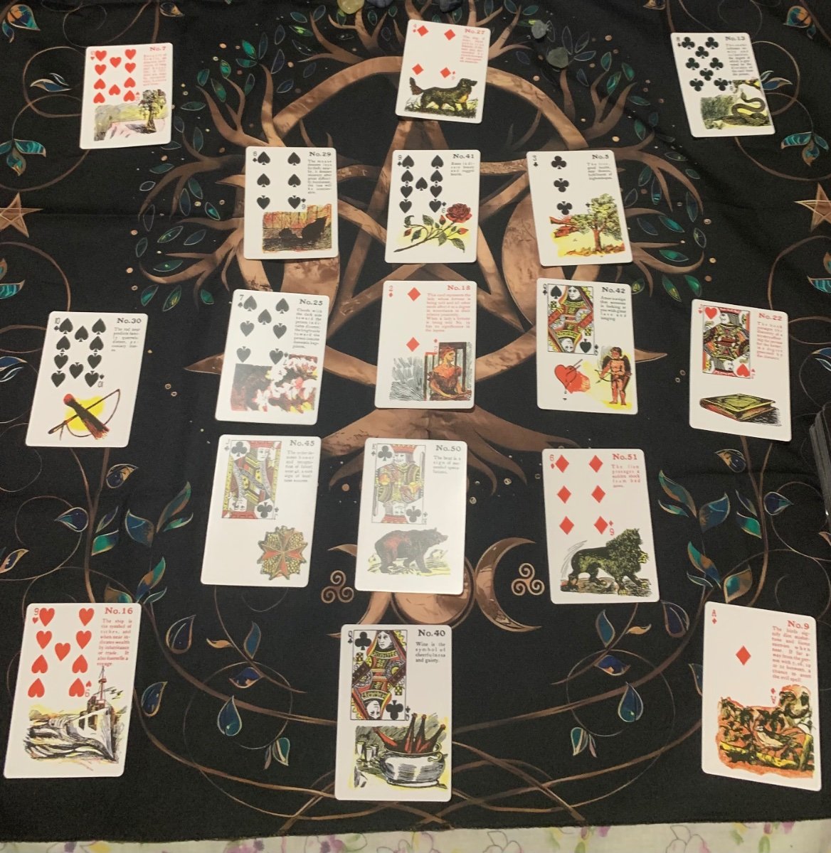 Tarritqueen Posted October 9, 2023 Posted October 9, 2023 Hey, I am trying to learn gypsy playing cards techniques and was doing a reading on myself about my my general future. I am very confused so I need help. I did 16 card reading with my inner circle including: Bouquet - Dog - Snake Mice - rose - tree Whip Cloud - woman - Cupid Book Honor - Bear - Lion Ship Wine Bird I see in my near future I might suffer small loss (mice) related to my romantic life (rose) and health (tree) leading me to have uncertainty (cloud) about men who are attracted to me (Cupid) I might receive some shocking news (lion) and that I correctly speculated (bears) bringing me recognition (honor) and happiness and recovery of what I lost (white part of cloud facing the women +mice being near) for my far future, I see someone I trusted (dog) betraying me (snake) but I would uncover (book) who it is and suffer some misfortune (bird) as a result, but I will be engaging is social networking (wine) and international trade (ship) that might lead to some loss (whip) but eventually it will bring profit and happiness (bouquet). I don’t feel right though.