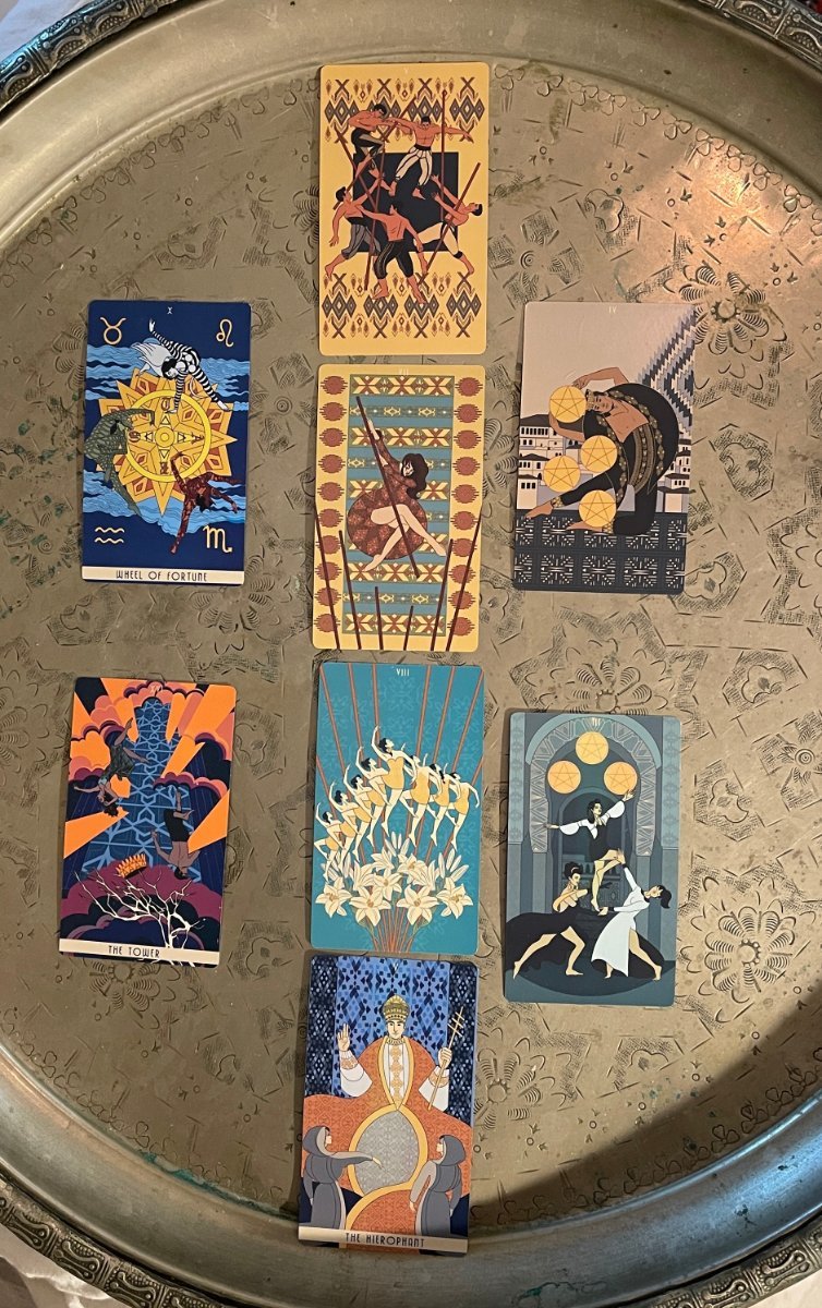 Misterei Posted October 11, 2023 Posted October 11, 2023 (edited) Deck Interview: Divine Deco The box says it's influenced by Balkan art ... Mostly it strikes me as an homage to Ballet Russes. Considering that Ballet Russes is the only ballet known to have caused a riot [1913 at Théâtre des Champs-Elysées in Paris] it holds a dear, dear place in my heart. Even if this deck doesn't CALL itself a Ballet Russes tribute deck ... that's exactly what it is. Will it hit as a reader? Don't know. One thing to note ... the card stock is THIN. It was only $23 ... but with this thin cardstock I would not pay a penny more. 1. Energy: Describes the deck’s essence / overall vibe = Temperance It's a balanced deck. Not particularly emotional. Neither dark or nor light. It has no extremes. I may feel "lukewarm" about it as a reader. 2. Timing: Why has the deck come to me now? / Why do I feel drawn to this deck now? = Q Coins Q Pents is a stalker card. My health is terrible and I can't dance anymore. This deck reminds me how much I loved dancing. How much I loved and still love the aesthetic and costumes of the Ballet Russes. How they influenced my costumes. This deck is nostalgic for me ... recalling days when I was fit and strong and the pure fun of dance and color and costume design. 3. Teaching: What can the deck teach me? What areas will it help me explore? = 2 Coins There are 2 twos in this spread. Balance is a theme here [as it would be in a dance deck]. The 2s taken with Temperance emphasize the theme of balance. 4. Challenge: How will the deck challenge me? What might I find difficult to work with? = 3 coins 3 coins means working together or building something ... which doesn't apply. It can also reference learning or school. That might apply. The images are aesthetic and thematic with a passing nod to RWS. I find it challenging to actually recognize cards. I thought Q coins was ace coins until I looked more carefully. 5. Limits: What areas are NOT this deck's expertise? For what topics should I read a different deck? = 2 Swords. This isn't a deck for making decisions. It's more about finding inner balance. It's forte is not yes/no type questions. It won't necessarily help create an action plan. 6. Grace: In what areas will the deck and I organically connect and flow together? = 6 coins So many of the cards in this spread have to do with balance or synthesis. I felt like this would be a "me" deck ... but 6 coins suggests I might end up using it for clients sometimes. 7. Whisper: the deck’s message / guidance for this moment = 9 swords every card except temperance was coins or swords. body or mind. I've just gone through a year of terrible anxiety ... and mental anxieties negatively impacted my physical health The guidance; it supports my sankalpa to create mental boundaries to reduce anxiety ... so that my body might heal. Edited October 11, 2023 by Misterei