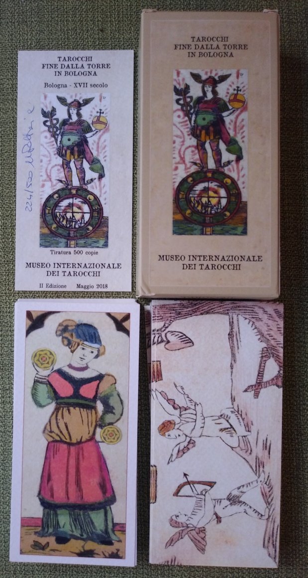 Rachelcat Posted October 9, 2023 Posted October 9, 2023 Hi, all! Sorry I missed you last week. Too much work and too much fun! But I'm back. This week will be Tarocchi Fine dalla Torre in Bologna, Museo Internatzionale dei Tarocchi, one of the decks I got because they are featured in Caitlin Matthews’ Untold Tarot. The little foldout says XVII century tarot of Bologna, edited by Arnell Ando. The original was a tarocchino, a deck that leaves out 2-5 of the suit cards, but this deck has added the pips to make a full deck. It has a different color palette and a strange back. I can’t quite tell from the foldout if it's original, but I think so. I feel very sad that I already creased a card before I even used the deck (because of a too-tight box), but I’ll deal with it. So wash, shuffle, and interview! (I guess I should be understanding if the deck has a grudge against me!) What is your most important characteristic? King of Coins Ugh, it cut on the creased card. Well, I guess that’s its most important characteristic. And its physical presentation. But it’s the king, so even though it’s not perfect, it’s very effective with physical readings. What is your strength? 9 Cups It’s good for reading about wishes, expectations, and personal wants. Your weakness? Page of Wands But it takes a while to learn how to actually use it. And put those wish predictions into practice. What can you teach me? 5 Coins Disappointment about the creased card! How can I learn it? 6 Wands All will be well if I just claim victory! What will be the outcome of our work together? 10 Cups All will be well, and I’ll end up loving it and loving to use it for others. It will be a living, growing tool in my toolbox.