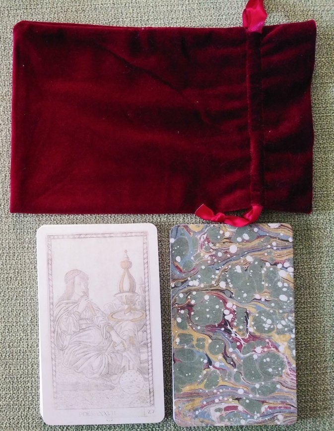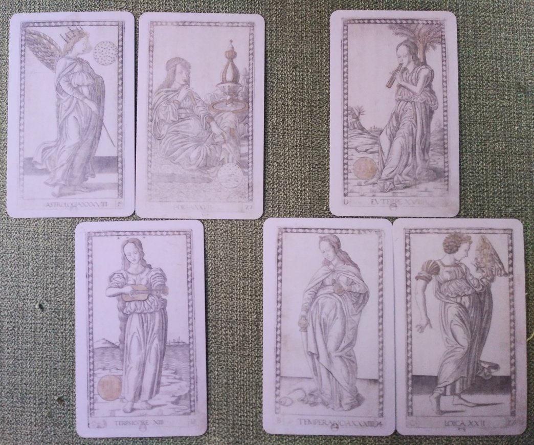 Rachelcat Posted October 23, 2023 Posted October 23, 2023 (edited) Hiya! This week will be Tarocchi Mantegna, which is neither a tarot nor by Mantegna. The deck of misnomers! It’s the last of my new acquisitions featured in Untold Tarot by Caitlin Matthews. As you probably know, it’s a deck of 50 cards, 5 sections (suits?) 10 each of: Societal estates (all men) (earth) 9 muses + Apollo (water) 7 liberal arts + 3 “sciences” (air) 7 virtues + 3 what I call “fundamentals” (fire) 10 celestial spheres (spirit) I have (pedantically) associated the 5 sections with the 5 elements and come up with keywords. Which I updated recently because I know planets better than I used to (the spheres), and I want my elements to be in order, lowest to highest. The elements also help to differentiate when there’s overlap between the cards: For example, there are both Urania, the muse of astrology, and Astrologia, a liberal art. There are no extant original cards: there are two versions of uncut sheets, now called E-series, about 1465, and S-series, about 1470. This week I’ll be using Tarocchi Mantegna, an E-series deck from MakePlayingCards.com. (I got the red velvet bag from one of the sellers of the other historicals I bought right on time!) Photos of the sheets are in the public domain, but it’s easier to buy print-on-demand. (I also have the 2001 Lo Scarabeo Mantegna Tarot, based on both series, beautifully colorized with silver foil. And Duck Soup’s Edwardian interpretation, Tinker’s Damn Mantegna Refined Edition.) Well, let’s give a regular interview a try! What is your most important characteristic? Terpsicore The muse of dance. The deck is about rhythm and health. What is your strength? Poesia It is good dealing with creativity and fiction. Your weakness? Astrologia But not as good with reality. What can I learn from you? Loica I can learn logic? From cards? Well, let’s give it a try. Maybe it goes with fiction. I’ll learn how to create logically consistent worlds. How can I learn it? Temparencia I can learn by being well balanced, and willing to combine things and move along a continuum. What will be the outcome of our work together? Euterpe The muse of music. It goes well with Terpsicore. It will be harmonious, and it will help me learn more about arts and systems. Well, that was kind of difficult. We’ll see what will happen the rest of the week! Rachel’s Interpretations of Mantegna Tarot 9-11-23.pdf Edited October 23, 2023 by Rachelcat Adding pdf