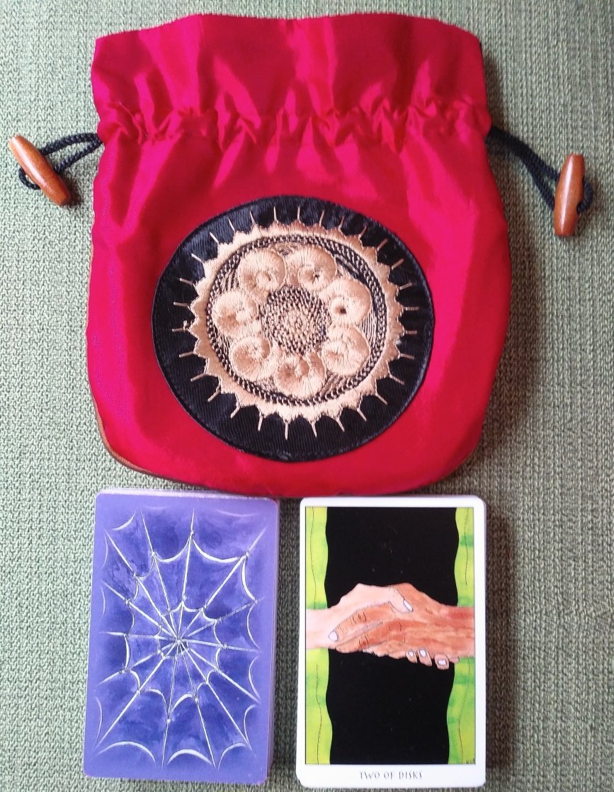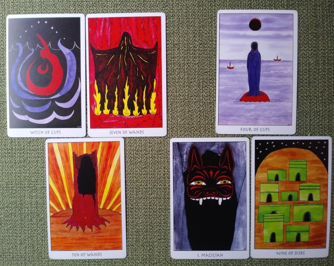Rachelcat Posted November 27, 2023 Posted November 27, 2023 Hi, crew! Thanks as always @fire cat pickles for leading us, and happy to see everyone here! (I'm remembering to post this week!) This week for me will be Tarot of the Crone by Ellen Lorenzi-Prince (creator of Dark Goddess Tarot and a Minoan Tarot). Another colorful one! It was published by Arnell’s Art and came with this lovely red bag and a pdf booklet. My calendar and the Spirit de la Lune booklet say that this is the Crone Moon (full moon in Gemini, new moon in Sagittarius), so I thought I’d finally get around to using this deck. (I have a complicated relationship with the Dark Goddess, so I hope I get along with this one a bit better.) Some of the majors are renamed. The suits are Wands, Cups, Swords, and Disks, and the courts are Beast, Witch, Grandmother, and Shadow. There are keywords for all the minors, along with the booklet info. The art is simple but evocative, but having the keywords handy is a help to understand what we’re looking at. Well, let’s get started with a shuffle and interview! What is your most important characteristic? Ten of Wands, transformation Well, that makes sense. It’s about the effect of age and the wisdom of age. A burnt out tree contains the shape of a potential person. Do you think the tree was struck by lightning? The person couldn’t emerge until the top of the tree was gone. What is your strength? Seven of Wands, risk The deck takes a risk of reworking tarot for its theme. It has to burn the old before it can become the new. Your weakness? Witch of Cups, siren It tempts us to give in to emotion. What can I learn from you? Nine of Disks, community (I think of 9s as individual, but let’s go with the keyword here.) I can learn to reconnect with the tarot community. How can I learn it? Magician By being creative and active. An actor puts on the mask to create a new character. It’s magical. What will be the outcome of our work together? Four of Cups, isolation Well, that goes against what I said before! Not everybody can connect with the crone theme. But it will be emotionally helpful to me as an crone myself. I'm posting my full moon readings in my journal thread.