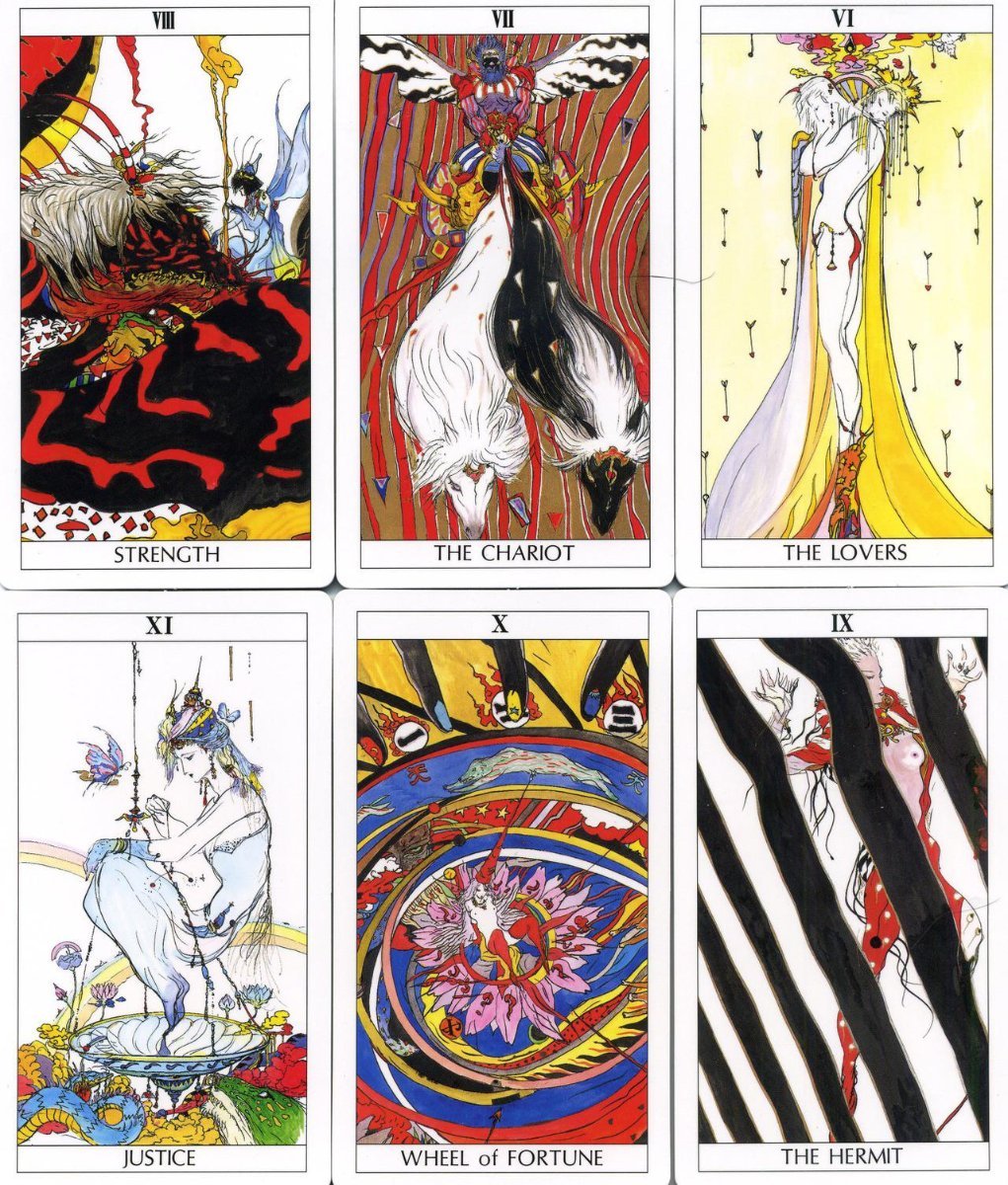 heaven Posted April 28 Posted April 28 (edited) I have a small collection of decks and oracles (less than 20) but my pride and joy is the Yoshitaka Amano Tarot. He is one of my favorite artists and when I found out many years ago that he'd made a deck, it became my most sought for. Finally, maybe 2-3 years ago, I was able to find it more affordably. The deck is out of print, but pops up semi frequently on auction. It was printed in the mid 90s, I believe. It comes with a full paperback guidebook with spreads and information, fully printed in Japanese. Though he is probably most known for his concept art for a particularly famous video game series, he is a contemporary / gallery artist with a distinct style and a staggering body of work across genres and mediums. I say this as I have heard this deck dismissed as a generic 'anime' styled deck, to which I strongly disagree, even aside my bias! It isn't for everyone by any means, nor in style nor voice. it reads beautifully with a mysterious, almost guarded air. I only find it difficult to read with, because I'd rather look at the artwork aha. I do wish each card were fully illustrated. Photos below are not mine, but for perusal. This is a pip deck with fully illustrated majors and royal families. Edited April 28 by heaven
