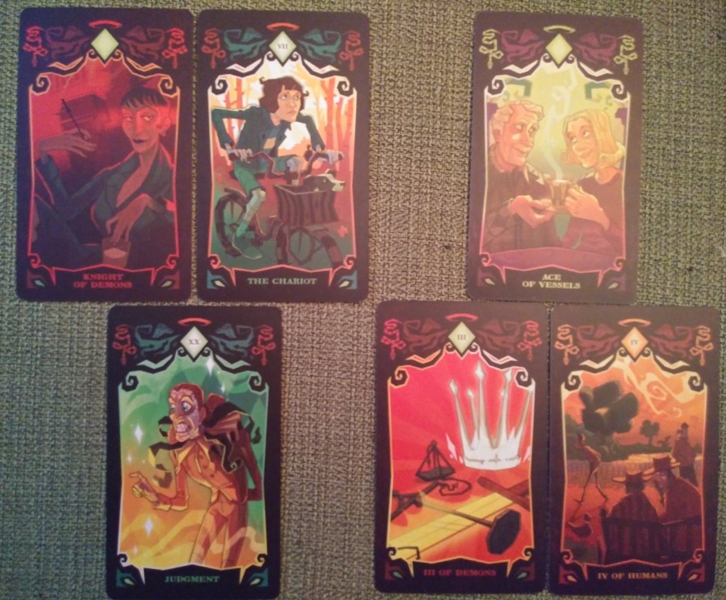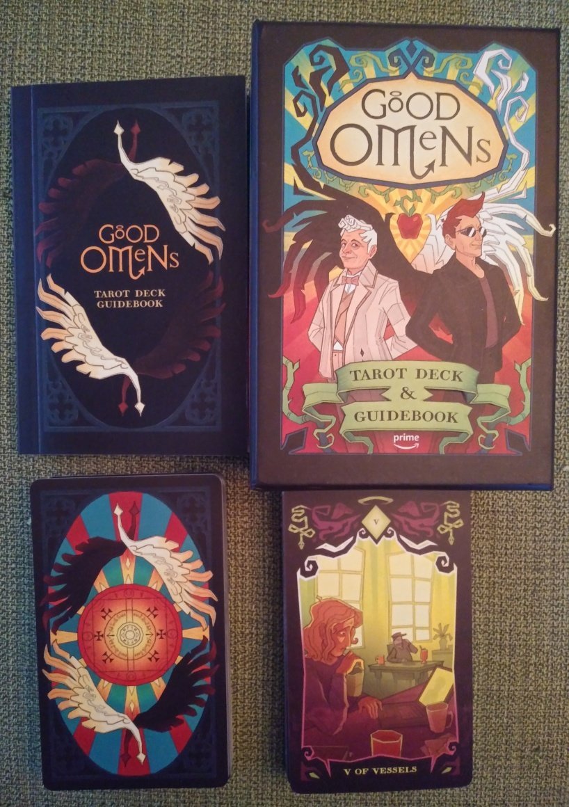 Rachelcat Posted December 5, 2023 Posted December 5, 2023 I'm here, I'm here! Hi, crew! I just scrolled by and saw "the devil, he's here!" and did a doubletake! But then your interp makes so much sense I'm not shocked anymore! This week for me will be the Good Omens Tarot Deck! Another new deck! I’ve been obsessed with the Good Omens tv series since the second season came out a few months ago, so of course I ordered the deck. I hoped against hope that this Insight Editions deck would be better than others I’ve been disappointed with (looking at you, Star Trek The Next Generation Tarot). Oh, good heavens (pun intended), I just looked up Insight Editions to make sure I’m maligning the right publisher (I am), and I see they have Ghostbusters and Princess Bride decks coming out next year! (I’m so dating myself with these must-haves, huh?) In any case, the Good Omens deck is actually pretty good! Good enough for me to like, keep, and use. Of course, I don’t agree with all the attributions, but they all make sense, and I’m enjoying figuring them out. I’ve started a table of titles for the cards made up by me like I did for the Jane Austen Tarot (out of print Lo Scarabeo, not Insight Editions). I’m re-reading the book to get my terminology and names correct. I’ll share it when I work out more kinks. The art is, I don’t know how else to say it, jagged. And colorful. I like the borders and backs. Every card has a border that includes a halo and Crowley’s snake temple markings. I can’t figure out why Michael looks like Crowley though . . . And there are a couple I can’t quite figure out what they’re showing, except a bunch of demons standing around . . . I’m working on it! The suits are Angels (wands), Vessels (cups), Demons (swords), and Humans (coins). The aces feature characters, like an extra court rank. There’s one mistake: The booklet says (which makes more sense) the Page of Humans is Elspeth the body snatcher, and the Knight of Humans is Mrs. Henderson the manager of the Ladies of Camelot show. The cards are reversed. I don’t think that will be much of a problem for reading, but I might have to resort to a Sharpie at some point. Well, enough intro. On to the interview! This should be interesting! Oh, spoiler alert for all my my readings! What is your most important characteristic? Judgment, Dagon Ugh! This is one I don’t agree with! This is the demon that Aziraphale-disguised-as-Crowley thinks might be his defender at his trial. But instead, she’s there to make sure the prosecutor and judge definitely convict him. The most important characteristic of the deck is that I won’t always agree with it, and I will be judging it. The positive is that, by combining tarot and the story, both are elevated. What is your strength? Chariot, Adam rides to the airbase Another disagreement! The Chariot should so be the Bentley. (But it’s 8 of Wands for speed, so that’s ok.) When Adam decides to fight against his fate, he immediately takes action to do that. I might not always agree with the deck, but it’s strong in its convictions, and I can follow along with them. Your weakness? Knight of Demons, Shax I love Shax. She’s this intimidating demon devoted to her work, but she’s a bit ineffectual. She’s clueless about how things work on earth. She doesn’t understand sarcasm and isn’t sure Crowley knows she’s threatening him. She also doesn’t get the number of demons she wants for the attack on the bookshop and has to make do with the few they give her. But through it all, she’s an earthly and hellish fashion icon. The deck’s weakness is it's confident and it has appeared on the scene in good time, but it might have been better if they had waited for more insight into the story (pun intended?). What can you teach me? IV of Humans, St. James’ Park A place of beauty and ducks where spies abound. They’re hoarding their secrets? The deck can teach me to appreciate its art and the fact that it exists as a physical possession. I won’t give it away (unlike a certain flaming sword). How can I learn it? III of Demons, sword, scales, and crown of the Four Horsemen The activating tokens (symbols) of War, Famine, and Pollution. (I think it’s interesting that the author modernized Pestilence to Pollution and then we had the pandemic. Pestilence isn’t so outdated after all!) I can learn about art appreciation and too many possessions (decks!) by studying, and also by understanding that these are perennial issues that never really go away. What will be the outcome of our work together? Ace of Vessels, Shadwell and Tracy At first we won’t understand each other, and then we’ll both change enough to get along quite closely! In spite of everything, it was love at first sight.