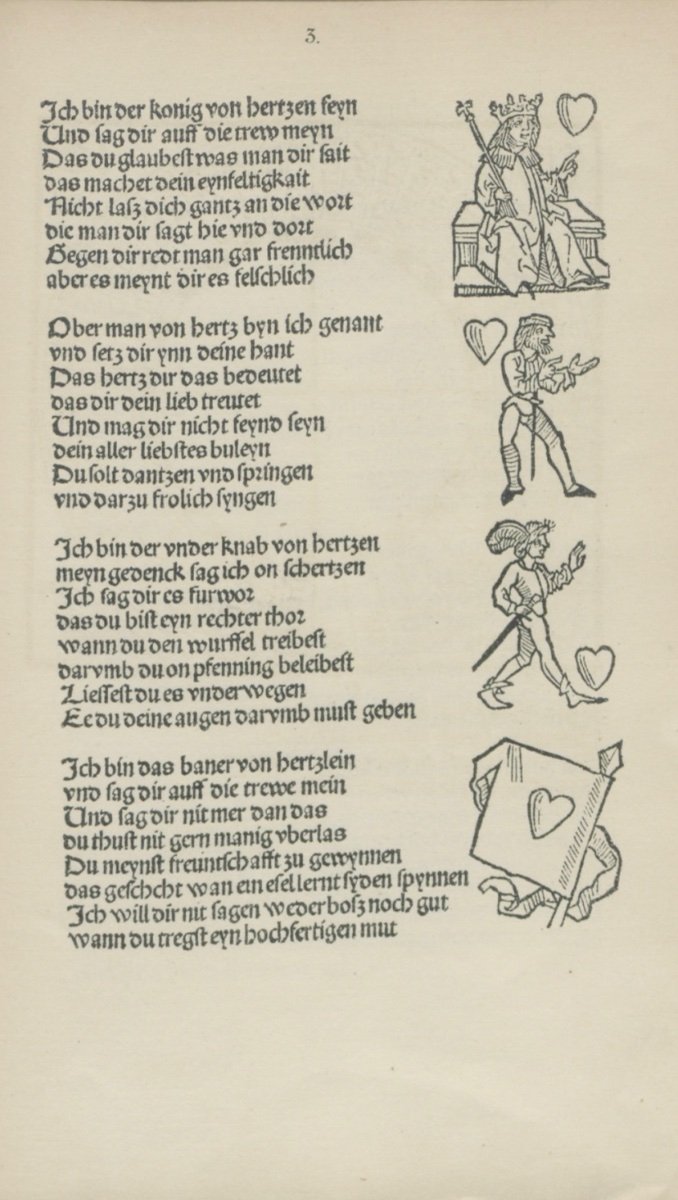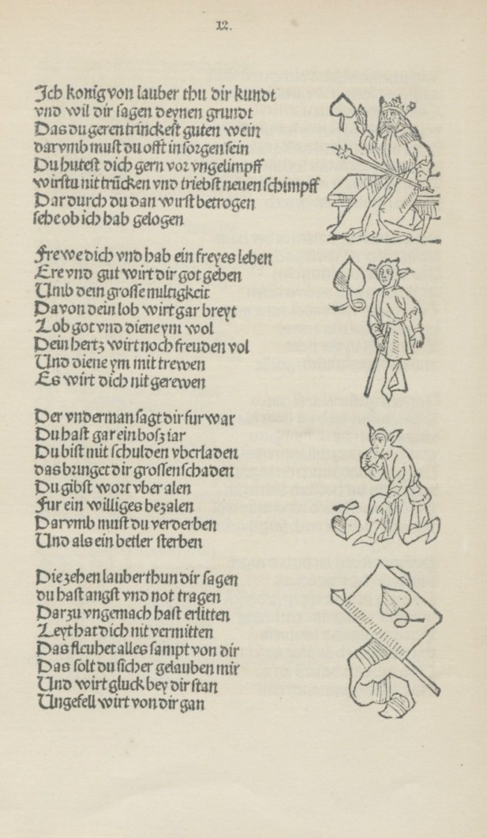 Nemia Posted December 18, 2023 Posted December 18, 2023 A book of lots (oracles) made from cards, And prepared because it’s interesting. If you don’t want to believe it You have learned them wrongly. I’m the noble King of Hearts And I tell you upon my honour If you believe what you were told It’s because of your simple-mindedness Don’t take the words as they’re spoken To you here and there In your face they talk nicely But the intention is evil. Upper Man of Hearts is my name And I set into your hand The heart which means That your love is faithful And may never be your enemy Your most beloved favourite. You shall dance and jump And sing happily. I’m the Knave of Hearts And tell you my thoughts jokingly I’ll tell you honestly That you’re a proper fool If you play with dice And lose your pennies You should stop it now And save your eyes. I’m the Pawn/Farmer of Hearts And tell you upon my word No more than that You don’t rely on others You believe that you won friends That happens when a donkey learns to spin I’ll tell you neither good nor bad As long as you are arrogant.