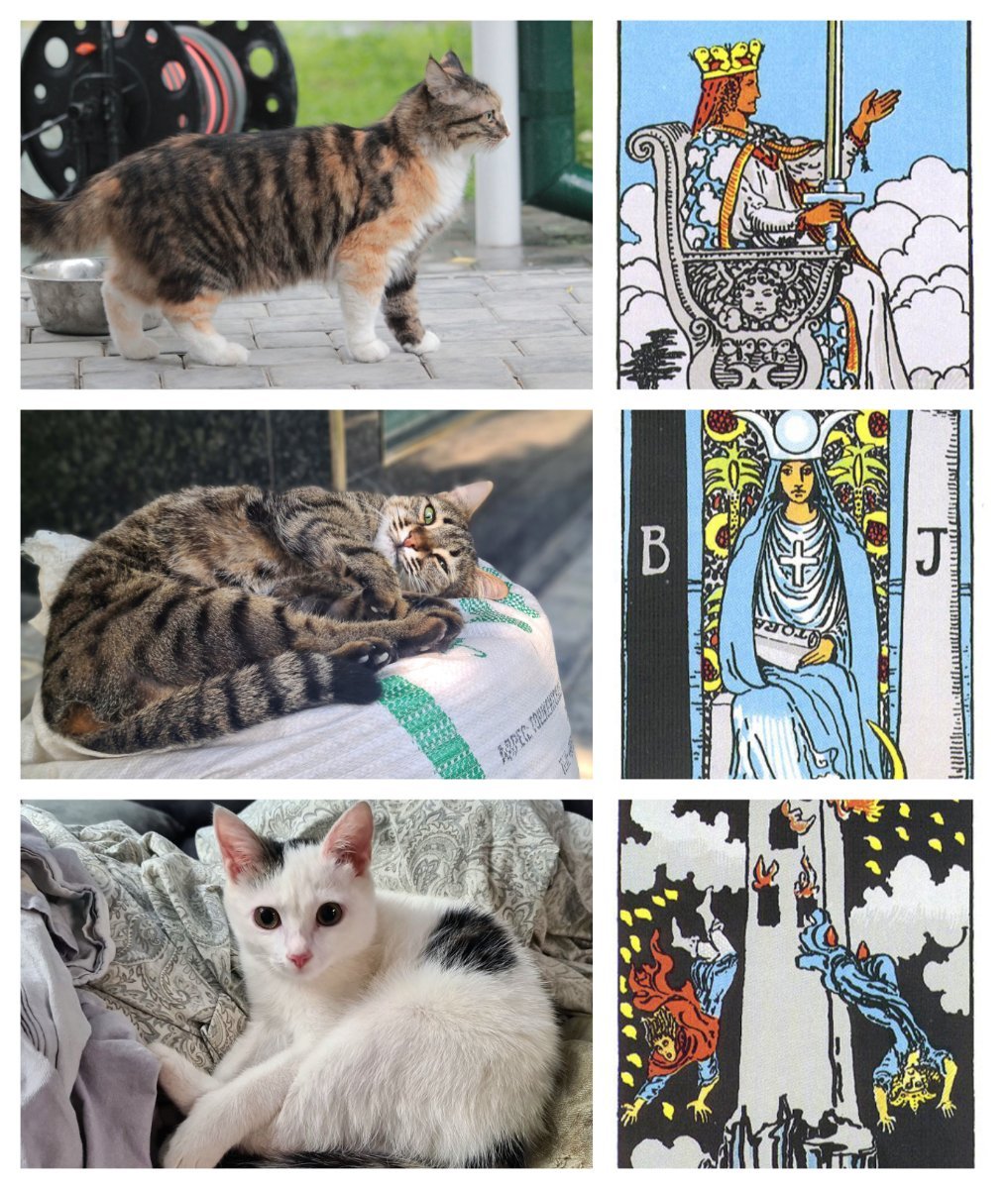 Eugenie Posted January 6, 2024 Author Posted January 6, 2024 @akiva, pet names can be difficult, especially if you live in a multilingual community. There is always a possibility that a name will sound funny in one of the languages. Of course anus is basically multicultural being a Latin word, eh well. I was writing something in Uzbek in my Facebook recently and people said one of the words reminded them of oral sex. There's no helping that lol. At last I found a bit of time to sit quietly and think of all my cats. The elder one, WingChun, is obviously the Queen of Swords. She's open and straightforward as a dog; been everywhere, seen everything; hunted, fought (unfortunately in our summer house you can't prevent it due to the faulty infrastructure); she's extremely intelligent and learned to open all doors in our home so we have to lock them now. Sometimes I think she does it to drive me mad. She dislikes other pets and can be really bitchy about new ones. With all that, she's an amazing companion and warms my soul by her presence. We found her on the riverbank where our summer retreat is situated as a tiny flea ridden kitten with a tremendous will to live; she followed us, asking that we take her, and wasn't even afraid of my large dog. Lagertha is, I think, the High Priestess. She walks with an enigmatic flair and likes to be alone. Actually she thrives alone. She's not socially impaired and spends time cuddling with us, too, but a lot of time she's in her musings. She was found by some people on a busy and dirty street in Tashkent and followed them home (where she was beaten by their tomcat in the most cruel manner). I wanted a tabby cat so here she is. She's a tiny cat, really miniature, but she can be a ruthless hunter and fighter. However she's good at negotiating with strange cats; they never attack. She only has conflicts with our own WinChun. The small one was found in June 2023. I really didn't want any new cats, but someone stuck a tiny kitten in a box and put the box in the sun. Uzbek summer. Of course I had to get her out, she was emaciated and dehydrated but stuck to life like a Bull Dog. Thought of adopting her out but the family said she was too nice. Well, she's not "nice", she's a Tower for the other cats, because she takes food from them, completely unafraid of their teeth and claws, and claims attention of humans; she's a velcro cat, she wants to be with humans all the time. (I love social cats. But we don't have enough people to make them all happy. I live with my husband in the rural home outside Tashkent, and our daughter is mostly in the city because of her studies). The name of this disaster is Betelgeuse because we wanted a stellar/celestial name. She eats so much, I am afraid she might grow and explode one day (just joking; I have to limit her portions though so that she doesn't harm herself).