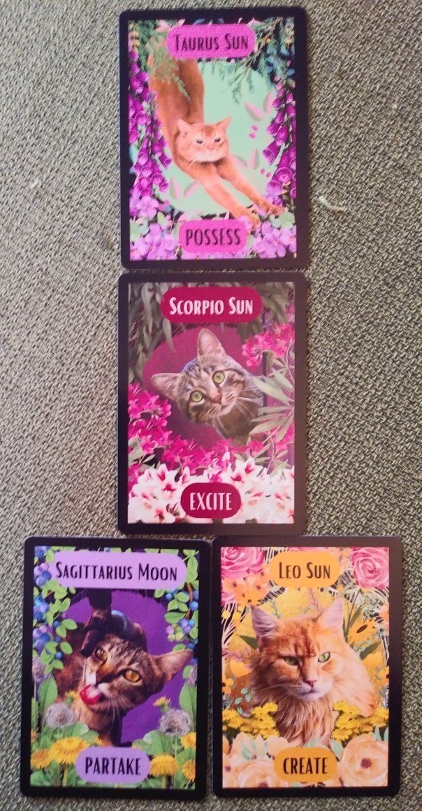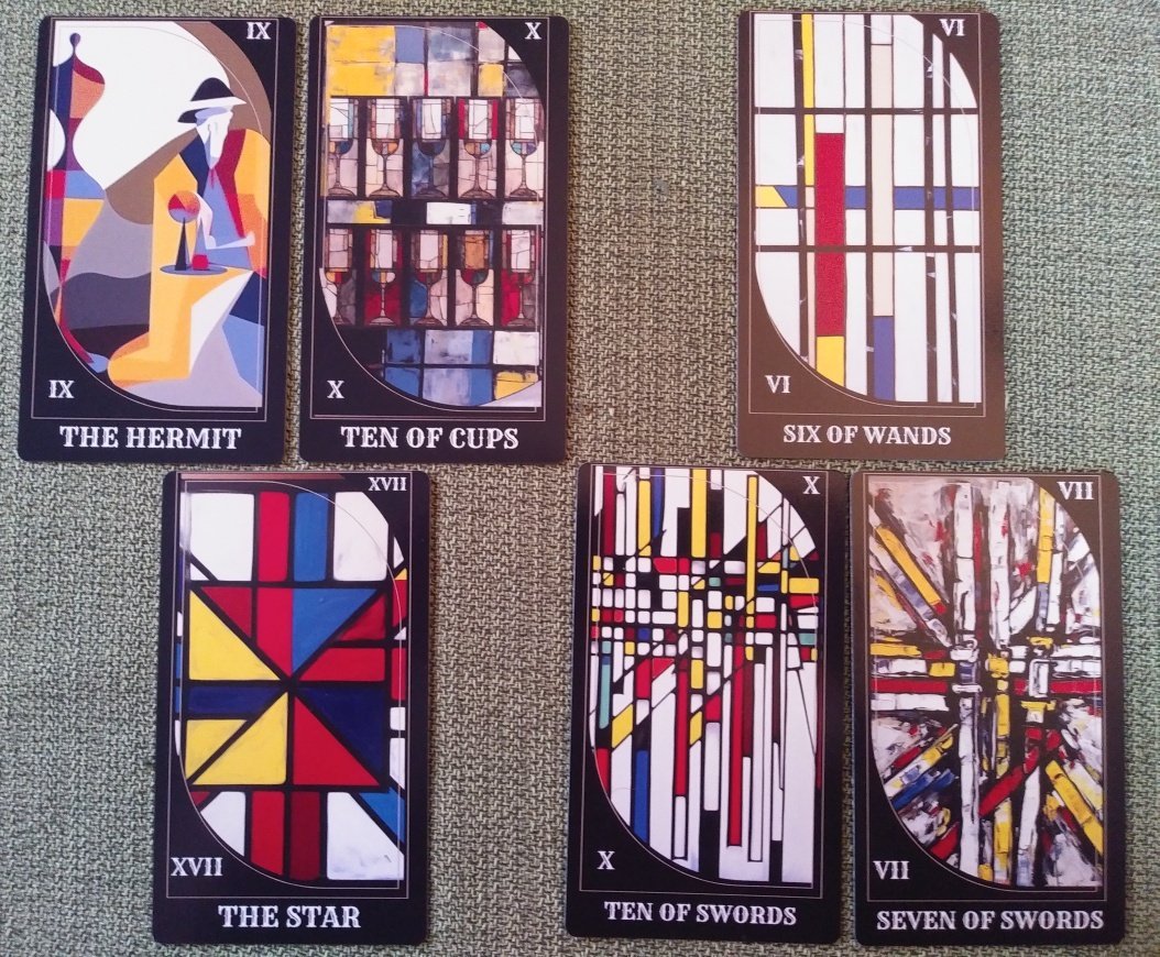 Rachelcat Posted January 29, 2024 Posted January 29, 2024 Hi crew! This week will be two from my latest The Game Crafter haul, Art Tarot Mondrian Style and Cats in the Garden Oracle Card Deck. I already have another abstract geometric deck, previous deck of the week, Tarot Vandestijl by Paraluman Studio, Ly Narcisco, but why not try another from this very small niche? It has extra cards, The Artists, The Muse, and The Windmill. Cats in the Garden is an astrological deck consisting of cards with keywords for sun, moon, and rising for each sign. Along with photos of cats and flowers. There is a pdf booklet with info and “tips” for each card and a spread for each sign incorporating the keywords. No info on choice of cats and flowers, so I figure it’s color-coded. Interview time! What is your most important characteristic? The Star Strong out of the gate! The deck is an offering of beauty to world and anyone who wants to receive it. What is your strength? Ten of Cups It’s for the art-loving community. It’s goal is happiness. Your weakness? The Hermit It probably won’t reach a very large audience, being a lowly print-on-demand deck. What can you teach me? Seven of Swords (Ah, no curved swords. But difficult to see difference between swords and wands.) It can teach me how to act on feelings. In a secret way. How can I learn it? Ten of Swords Another ten. By figuring out what ideas to share and which ones to keep to myself. What will be the outcome of our work together? Six of Wands And a strong finish! Our work together will be successful. And people will be able to see that. Only 36 cards for the cats, so a shortened interview. What is your strength? Leo Sun, Create Very cat-like! This cat even has a mane! The deck is a unique creation that should be used. Your weakness? Sagittarius Moon, Partake Cat is drinking water from an outdoor faucet. Same as previous deck, not many will partake of the deck’s opportunity. What can I learn from you? Scorpio Sun, Excite I can learn to be excited about practical astrology again. What will be the outcome of our work together? Taurus Sun, Possess In the end, it will be a fun little deck that I will keep because it’s an interesting niche. I see there's a photo limit, so see my journal for the rest of the photos. (I went a little crazy this week.)