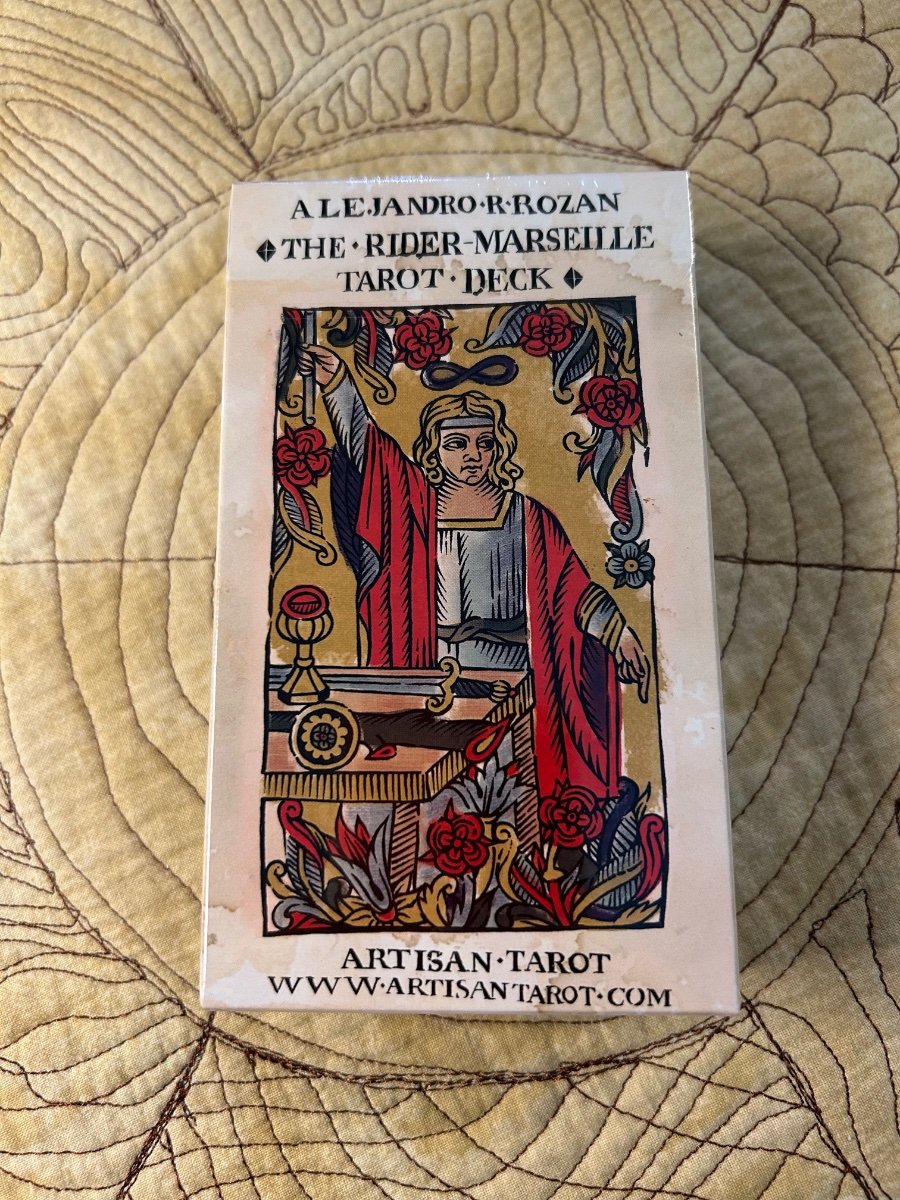 Madame Squee Posted February 3, 2024 Posted February 3, 2024 (edited) The Rider Waite Marseille Tarot Deck~Alejandro R. Rozan~Artisan Tarot I've never seen a Marseille treatment of RWS images before, and it's so much FUN!!! The eyes and expressions are my favorite part of Marseille, and that makes this deck my absolute favorite RWS clone. I haven't been in a reading mood for several weeks now, and this is the perfect deck to draw me back in. Right now, I'm just enjoying shuffling the cards and looking for interesting combinations. The deck shuffles like butter. There's a light linen finish on the cards, matte, no glare. The colors and coloration are fabulous -- matches what I see on my computer screen (but unfortunately my photo below of the Emperor looks dark). I just love everything about this deck, especially the concept. I'm glad I'm on their mailing list. Alejandro is offering a free on-demand lecture on the deck. (I plan to watch it this afternoon.) https://artisantarot.com/shop/lectures PS: The side-eyes on the Emperor card Edited February 3, 2024 by Madame Squee add info
