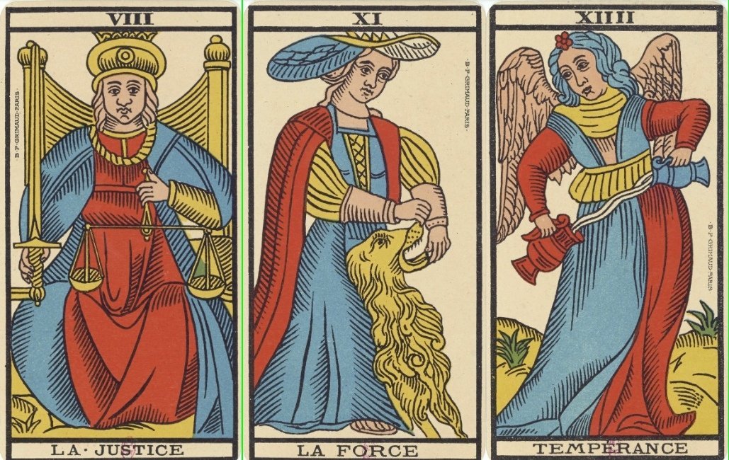 Pio2001 Posted February 4, 2024 Posted February 4, 2024 (edited) I open this discussion to share some paintings and depictions of Strength, Justice and Temperance across history, that I found on the web. It is interesting to compare them with the pictures that we can see in tarot. These three arcana are part of the seven christian virtues, that include four cardinal vitues: Fortitude (Strength), Justice, Temperance and Patience, and three theological virtues: Faith, Hope and Charity. But only three of them made their way into the tarot. The topic will be divided into several posts, as only three pictures are allowed by post. All pictures are from free sources, and all links to the originals are included. Let's first have a look at the tarot traditional depictions. Here they are in the Waite-Smith tarot, as they appeared in 1909, drawn by Pamela Colman Smith. And here is how they are in the Tarot de Marseille. This is the Grimaud version of 1930, but it follows exactly the Pierre Madenié tarot of 1709 (except for the colors). Sources: https://en.wikipedia.org/wiki/Rider–Waite_Tarot https://gallica.bnf.fr/ark:/12148/btv1b10539685w.r=jeuCart tarot?rk=171674;4 Edited February 4, 2024 by Pio2001 Pictures too large