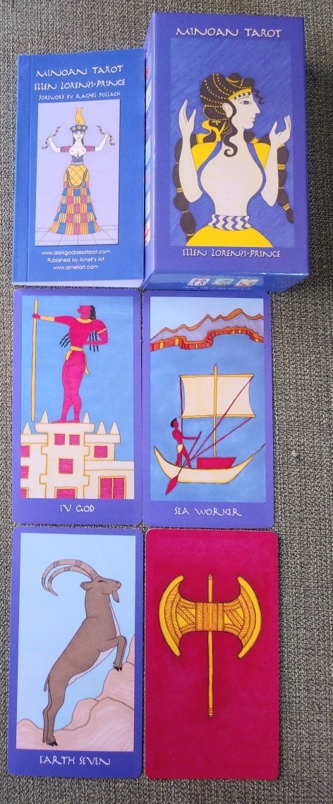 Rachelcat Posted March 18, 2024 Posted March 18, 2024 Hi folks! @BodhiseedCan't beat a kitty playing a video game! And I like how you linked the cards together so easily! This week for me will be another Minoan deck, Minoan Tarot by Ellen Lorenzi-Prince, creator of the Dark Goddess Tarot (my go-to goddess deck). The booklet has a foreword by Rachel Pollack, along with sections on the Minoans, their religion, and the labrys (the back illustration). Each card has a title (not so much a keyword), and each card description includes “messages from the [title].” Some majors are renamed. Suits are Earth, Sea, Sky, and Art. Courts are Worker, Priestess, Master, and Mistress (again implying female ranks are higher than male). On to the interview! What is your most important characteristic? Sky Master (King of Swords) The deck is an intellectual tour de force. It controls the narrative like the king controls the ducks. What is your strength? Sky Four The birds and their eggs are save in their nest and don’t want to go elsewhere at least yet. As with the previous card, the deck’s strength is its intelligence and its adherence to its theme. It’s a closed system in a good way. Your weakness? Sky Ten It might be a bit too airy and cerebral, floating high above us “regular” tarotists! What can you teach me? Strength It can teach me to be strong in my own ideas and systems. She hasn’t just tamed the lion, she’s taking it forward to where she wants to go. How can I learn it? Ancestor (Death) Let go of what doesn’t work and keep what does. Test the system to the breaking point and see what survives. Offer it as a complement to the tradition, not as a revolutionary rejection of tradition. What will be the outcome of our work together? Art Mistress (Queen of Wands) I don’t know if I want to be served wine by a jacked-up giant ant, but . . . ! We will work together well, and the deck will help me take control of it in order to use it well (relates to Strength). Well, this seems to hang together! We’ll see how it goes this week.