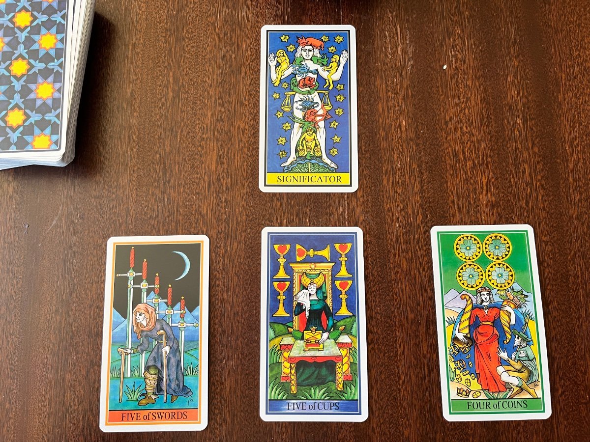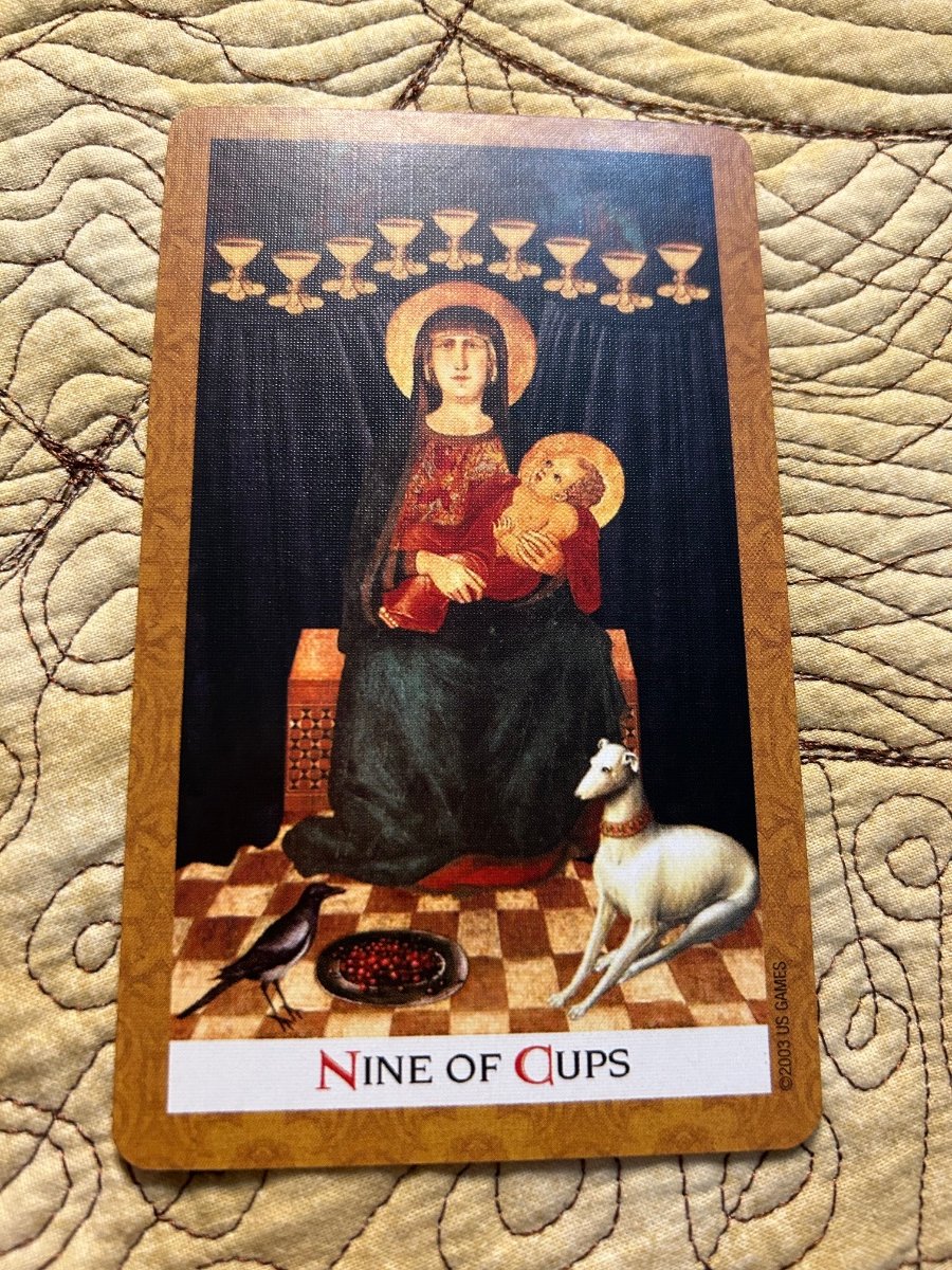 sweeneyish Posted May 6, 2024 Posted May 6, 2024 My “What will I encounter this week?” with Dame Fortune’s Wheel Tarot: First, love that he includes a Significator - I never work with them usually, so it’s fun to play with. I went for an open reading here - no set positions. Five of Swords: This person is looking pretty beat up! I competed in a Brazilian jiu jitsu competition yesterday and got caught in a nasty armbar, so I woke up with a good deal of pain this morning that this card captures. In general, quite a hard day today that is very Five of Swords in this deck - My daughter is home sick from daycare again, meaning work is piling up and a bunch of plans were delayed. The figure in Five Swords looks to the right, towards: Five of Cups: She is opening a jewelled box, looking quite sad. For this deck, the meaning is an inheritance, legacy, gift, donation - something good that is also a little sad. We’ll see if this prediction pans out during the week. Four of Coins: The woman on the card (mentioned to be “Plenty”) drops treasure to the ground in front of a beggar, while the food is being kept above the beggar’s head - or maybe she just hasn’t dropped it yet. This can be a gift, a present, generosity, or being of benefit. I take this advice to share if I have an unexpected gift this week, and to make sure I share the right thing if I do.