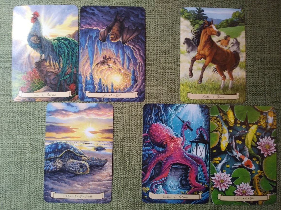 Rachelcat Posted May 6, 2024 Posted May 6, 2024 Hi, @fire cat pickles and group! Another week, another deck! I used the Llewellyn Beltane coupon for three new decks, one preordered. So this week will be Everyday Witch’s Familiars Oracle. I like Everyday Witch Tarot, the ideas and the art, and I think it’s fun in a Halloweeny witchy way. Not so with the Everyday Witch Oracle because I I’m not interested in seriously spiritual witchiness. (And it would probably be disrespectful to misuse someone else’s spiritual tool.) But this is basically an animal oracle with cool art, so I went for it! It has 9 animals for each element plus 4 mythical animals for the spirit element, making 40 cards. (I haven’t been able to figure out if the numbers have meaning. I’ll work on that this week.) Years ago I did a very deep dive on Druid Animal Oracle, complete with notes, so I have a pretty good grounding in the animals that overlap, plus general knowledge of other animals and mythical animals, so we’ll see how often I have to visit the booklet. The booklet also has a chapter on “Familiars, Guides, and Protectors” and spreads. Well, let’s see how it’s going to go! 3 water, one each of other elements, no spirit. What is your most important characteristic? Sea Turtle Booklet is about being of two worlds and going slow until you figure out what you want to do. Slow and steady wins the race. I can take my time and enjoy the messages from the animals without having a solid goal in mind. What is your strength? Bat Its messages are hidden in plain sight. They come out of the dark, the dark is full of life. Another animal of two worlds, it’s the only mammal that can truly fly (not just glide). Booklet is about dreams. Your weakness? Rooster Opposites for sure! The deck is not so much about waking up and smelling the coffee. The meanings aren’t all that obvious or straightforward. More about dreams and impressions. Booklet is about confidence and self-presentation. What can you teach me? Koi Lenormand fish = money. Coins in the pool. Booklet says good luck and prosperity. All the dreaminess aside, it can teach me about practical matters and how they’re really emotional matters. And how to grab good luck when it shows up! How can I learn it? Octopus Why isn’t octopus number 8 of water? Also has coins. Booklet is about water magic, thus the crystals and cauldron. Illustration suggests shipwrecks. I can learn to accept luck and prosperity by doing intentionally and intelligently. What will be the outcome of our work together? Horse Freedom, movement, swiftness, the land I will work with it freely, using my own ideas and impressions. That will lead to a feeling of strength and moving forward. Looks good so far!