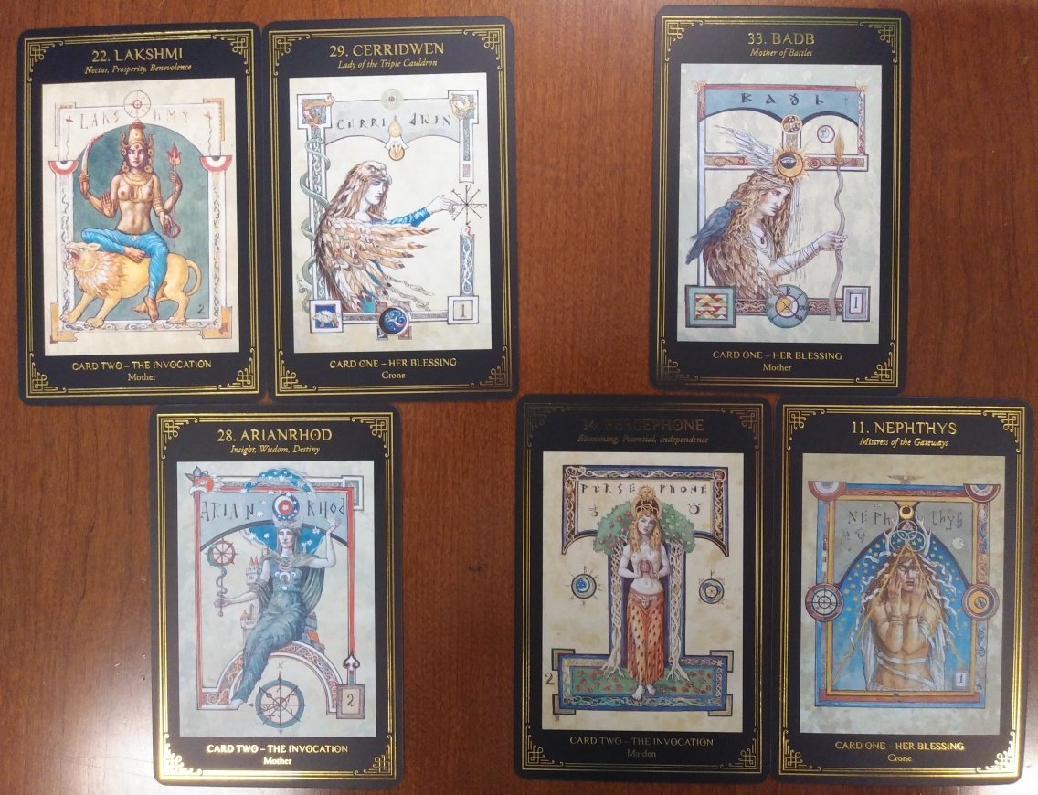 Rachelcat Posted May 14, 2024 Posted May 14, 2024 Hi all! Here I am! A day late and a dollar short! Mothers Day and moving offices have taken away from tarot time. This week for me will be the other new deck I got with Llewellyn’s Beltane coupon, the Great Goddess Oracle by Lucy Cavendish, artwork by Jake Baddeley, published by Blue Angel. I have several goddess decks, but I was interested in getting a closer look at the art. (Current count of my collection’s Gods and Goddesses theme category: 6 tarots, 10 oracles.) The concept is very structured: a maiden, mother, and crone from each of seven cultures/ mythologies, with two cards for each goddess, “Card One – Her Blessing” and “Card Two – The Invocation.” Each Card One is titled “Lady of . . .,” and the book has the goddess speak for herself. Each Card Two has three keywords, and book tells us how to call upon the goddess to grant us those attributes. So 3 times 7 = 21 goddesses times 2 = 42 cards. The cards have shiny gold borders and lettering. According to the book, the art is inspired by illuminated manuscripts of the Middle Ages. Let’s see what the goddesses have to say for themselves. What is your most important characteristic? Arianrhod, Insight, Wisdom, Destiny It’s a deck that helps you understand change, the turn of the silver wheel. What is your strength? Cerridwen, Lady of the Triple Cauldron The deck speaks of transformations and magic. Your weakness? Lakshmi, Nectar, Prosperity, Benevolence It’s not that focused on practicalities. What can you teach me? Nephthys, Mistress of the Gateways The deck can teach me about not just change and transformation, but also moving on to a really different place. How can I learn it? Persephone, Blossoming, Potential, Independence Beginner’s mind. By making the familiar strange, and by beginning again if necessary. What will be the outcome of our work together? Babd, Mother of Battles It will be a struggle but will make me stronger? Well, there seems like a lot under the surface, but just reading the card text also seems to work. With a little bit of goddess knowledge. We’ll see about all that this week.