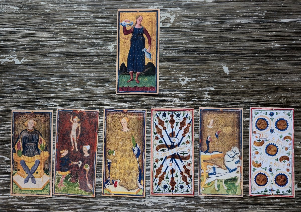 Penthasilia Posted June 19, 2024 Posted June 19, 2024 (edited) Posted my thoughts on the reading in the journal section but figured I would put a picture in here so you all can see what the deck looks like. Definitely like it- it reads really well. Very happy to have found a Visconti I can read with. It is the perfect size, beautiful card stock, shuffles like a dream and is more approachable than some of the others I have tried. Edited June 19, 2024 by Penthasilia Adding info on card stock
