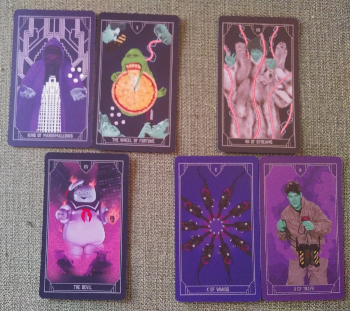 Rachelcat Posted July 15, 2024 Posted July 15, 2024 Hi all! Thanks @fire cat pickles as always! And there's a devil for me this week, too! This week will be Ghostbusters Tarot Deck, another fandom deck from Insight Editions. Criticisms first: Photos of the movie characters/actors are incorporated in the art, but their faces are green or purple. And to tell the truth, the art isn’t my favorite. The minors are an odd combination of pips and illustrations. The deck seems to be based on the first two movies. (And maybe the early video game? The booklet gives the name of the library ghost, which I think was only referenced in the game.) The Wheel card, Slimer, attributes the four ghostbusters to the four suits: Wands=Peter, Traps=Egon, Streams=Winston, and Marshmallows=Ray. See my attached list of all card attributions. There are a few spreads in the booklet. I like the backs! Well, let’s see what we get with an interview! What is your most important characteristic? The Devil The deck is more about what’s wrong than what’s right. Or it focuses on demons and spirits. To our delight! What is your strength? The Wheel of Fortune Meta: This card is the key to the suits. Oh, except streams and traps are switched. Also, as silly as it looks, it can be useful. And, like Slimer, it’s messy but fun! Your weakness? King of Marshmallows Ivo Shandor, the occult practitioner that made the apartment building a Gozer temple. He created something physically powerful. The deck is more about creating a fandom thingy than actual readings? What can I learn from you? II of Traps I can balance my positive and negative feelings. How can I learn it? X of Wands By realizing sometimes it’s overwhelming, and that’s ok. What will be the outcome of our work together? VII of Streams In Ghostbusters II, a mink coat comes to life and scampers away. The deck will turn out to be attractive but deceptive and emotionally manipulative. And maybe even shocking! Well, that was fun! We’ll see how it goes! Ghostbusters Tarot Deck.pdf