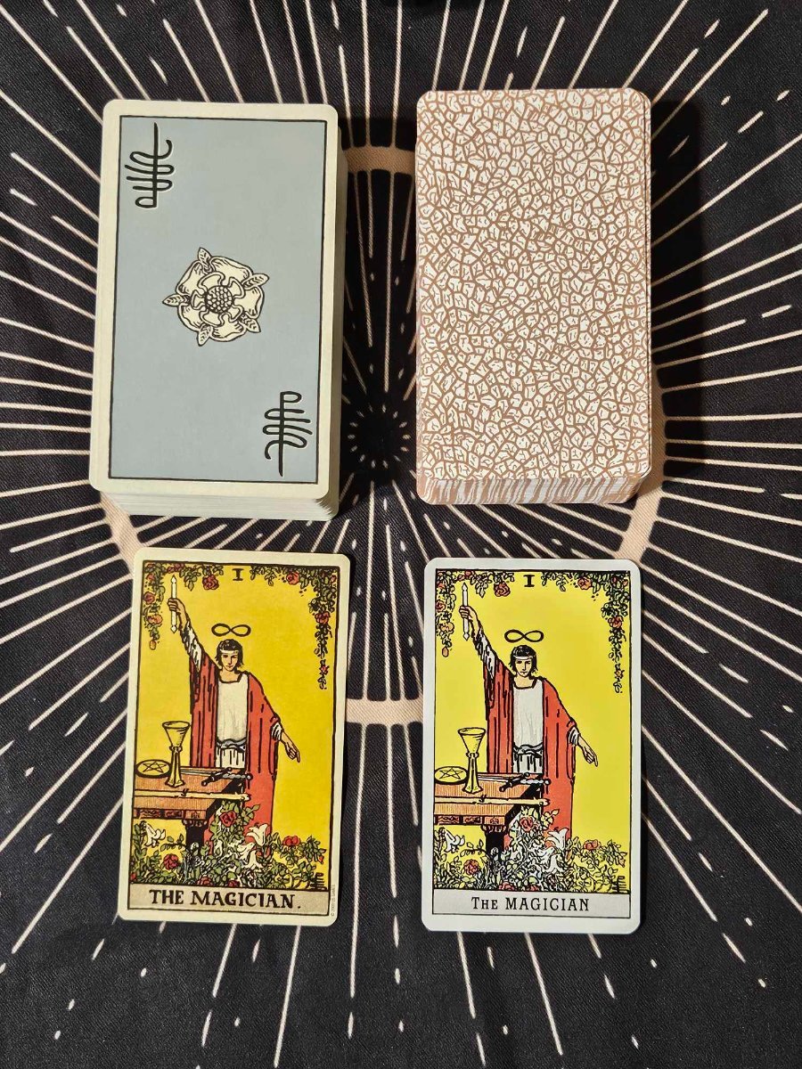 Wyrdkiss Posted July 24, 2024 Posted July 24, 2024 (edited) Greetings, I made a promise to show a pic of the back of the German pressing of the RWS premium edition, and I cannot locate that chat. So Here's a fresh post and I hope all who desire to see it find the path. My personal deck is on the left, it is the Centennial edition, standard size. On the right is also a standard, and it is my brand new from across-the-pond A.E. Waite Premium copy, which will be for clients only. Quite a difference, isn't there? Which do you prefer? Edited July 24, 2024 by Wyrdkiss