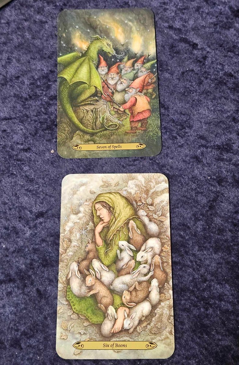 Wyrdkiss Posted September 22, 2024 Posted September 22, 2024 Greetings everyone. I kept my question straightforward recently. The first card, bottom, is a message from ancestors about my inner self. The top card, 2nd, is my outer world and their commentary or message. I used the Forest of Enchantment deck, which uses variances for the suites but is still essentially RWS focused. The bottom card, my inner space, is quite a touching image -- but the description emphasizes that the woman curls up to sleep alone in the woods, battered by life's trials and ready to pass away. But the rabbits emerge and provide an unexpected new chance, warmth until morning. The top card , outer world, depicts a level of persecution and judgement, with the creature intending to be the querent. I know this is possible, but am uncertain exactly where it may apply in my life. I suspect it will emerge over time. This deck has one of the most comprehensive and well written books I've ever seen accompany a mass market deck. it is large, well produced, and their heart and soul and magic went into it. This is the only book and deck combo where I've had an experience akin to the book of thoth and crowley's pack. and that is: I open it and read a passage to explore a connection in my spread, and I am suddenly moved deeply or floored by a line I could swear I don't recall reading prior. The emphasis, and intent of the deck designer, does its work, when needed. I enjoy those moments. Immensely.