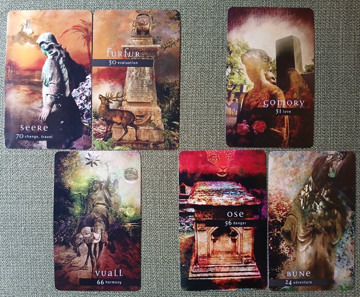 Rachelcat Posted September 16, 2024 Posted September 16, 2024 Hi all! We're back at it again! This week will be Fallen Angel Oracle Cards by Nigel Suckling, CICO Books. It’s a repurchase for me of what I think is a new edition. (1) The artwork of deck I gave away was too green and dark and difficult to see the images. I think this is definitely better. But now I remember the other two reasons I gave it away: 2. It’s based on a different list of demons than the Travis McHenry decks that I’ve been working with, considered more “standard” according to Skinner, The Complete Magician’s Tables. It says this deck is based on the Wierus Rudd 6482 Lemegeton manuscript, and the other decks are based on the Harley 6483 Lemegeton manuscript. They have many of the same demon names and attributes but in a different order, with other differences. 3. There’s a lot of duplication of keywords. I mean, use a thesaurus! There are only 72 cards, there’s no reason to have 5 “Danger” cards. Out of 72 cards, 27 have duplicate keywords. (Yes, I’m obsessive, so see attached list.) But I like the illustrations (looks like moody collages of cemetery photos combined with other art), and I want to like the deck and give it another try. So here we go. I think I’m going to put in the demon descriptions from Complete Magician’s Tables. Because I can. What is your most important characteristic? 66. Vual, harmony Dromedary or man speaking in a bass voice. (I just re-learned what a dromedary is.) Its visuals harmonize (for the most part) with the descriptions and the darkish theme. What is your strength? 30. Fufur, evaluation Hart with fiery tail or form of an angel. (I’m a big Good Omens fan, so enjoying a portrait of Furfur! There are also Shax and Asmoday in this deck, but no Mephistopheles, Beelzebub, Dagon, Hastur, or Ligur. Maybe I’ll use Bael for Beelzebub.) The deck requires taking a closer look at all the demons. Your weakness? 70. Seere, change, travel Beautiful man riding a winged horse. There’s the winged horse, high up in the air! It’s not different enough from the other demon decks. It doesn’t take my studies a step forward. What can you teach me? 24. Bune, adventure Dragon with 3 heads: dog, gryphon, man. Only the gryphon’s head is visible here. The deck can teach me to take risks in my oracle practice and enjoy the detours. How can I learn it? 56. Ose, danger Leopard pretending to be a man. The leopard above a tomb! One of the 5 danger cards. Danger indeed. I can learn to go with the flow by accepting the danger and even enjoying the beauty of it (cat) even though it’s dangerous. What will be the outcome of our work together? 51. Gomory, love Beautiful woman riding a camel with a duchess’s crown. There’s her camel way in the background on the left. A two-camel reading. I’ll move forward to fall in love with the deck after all. How does the song go? “With all your faults, I love you still.” Interesting beginning! We’ll see this week. Fallen Angel Oracle Cards keywords.pdf