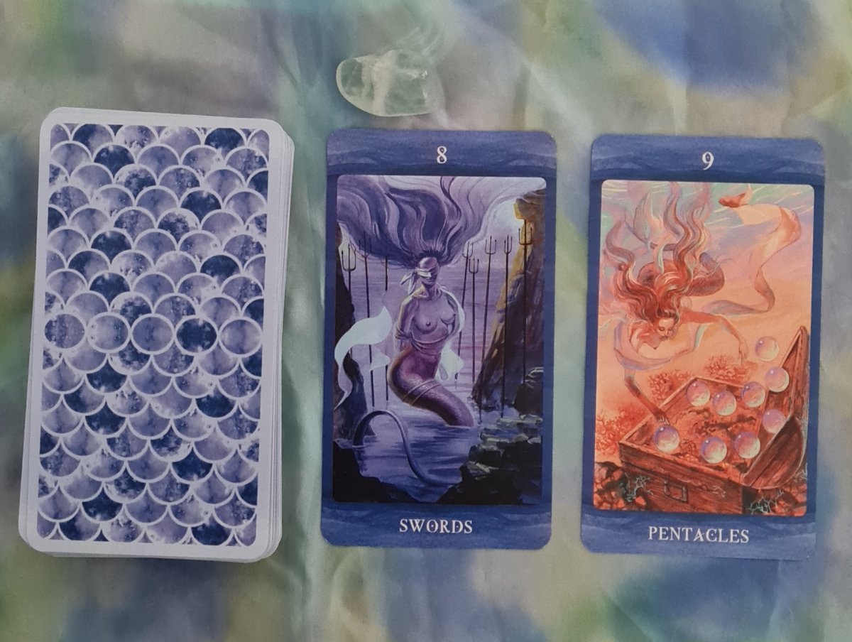Hemera Posted September 25, 2024 Posted September 25, 2024 (edited) Mermaid Tarot (LoScarabeo) I like Mermaid decks but I´ve yet to find a good one. This new LoScarabeo one that I´ll be using this week is beautiful and mysterious, just like mermaids are and I like the new backs of this printing. The perky breasts are a bit too obviously drawn by a male hand, though, and I find them annoying most of the time. They almost spoil a few nice cards for me. I´ve tried Leeza Robertson´s Mermaid Tarot but as beautiful as it is, it lacks some of the mystery and elusiveness of mermaids. The cards are very cartoony with lots of detail. They are easy to read as the stories are very obvious, but that´s about all they seem to give to me. No mystery or magic there. (Having said this, I may have to try it out properly in here some week, just to see if that´s really all they can offer me.) I purchased this new LoScarabeo printing (with the new backs and nice blue borders) just a few weeks ago but it has not given me any good readings so far. I also own the older version which has more teal colour and slightly strange card backs, and I have to say I´ve never used it very much. I usually like teal but, in this deck, (old version) it gives rather a muddy and murky feel, especially together with all those pointy breasts. Anyway, I wanted to try this new version here in DotW and see if I can bond better with this new deck. I wish I could use this more in my readings in the future. I thought I´ll try pulling a card a day during this week and see how the deck will behave. Day 1 Well, I don´t know what happened but today’s card was very accurate and spot on indeed! Maybe just giving this deck enough time and attention was what it needed? I´m currently recovering from a flu and today I´ve still been bound to my house. I´m surrounded by white tissue papers, just like that white cloth is floating around this mermaid. 😆 The Mermaid has a bandage in her eyes. Maybe she has pinkeye like me! The sharp tridents (swords) surrounding her make me think of the headache and sore throat and sore muscles that I´ve been having. I think tarot is sometimes at its best when it gets very literal. Today it certainly was. Day 2 Today´s card was the 9 of Pearls (Pentacles). I had to laugh out loud when I saw it. It is the card of luxury, and ability to treat oneself, as well as the card of improvements and large sums of money. Well, I had my hairdresser´s appointment today, which is naturally all about treating oneself, and it is luxury – and yes, large sums of money are changing hands, too. And some improvement is happening (we hope!😉) Great day just for myself, and just what I needed after that nasty flu. Edited September 25, 2024 by Hemera added the photo