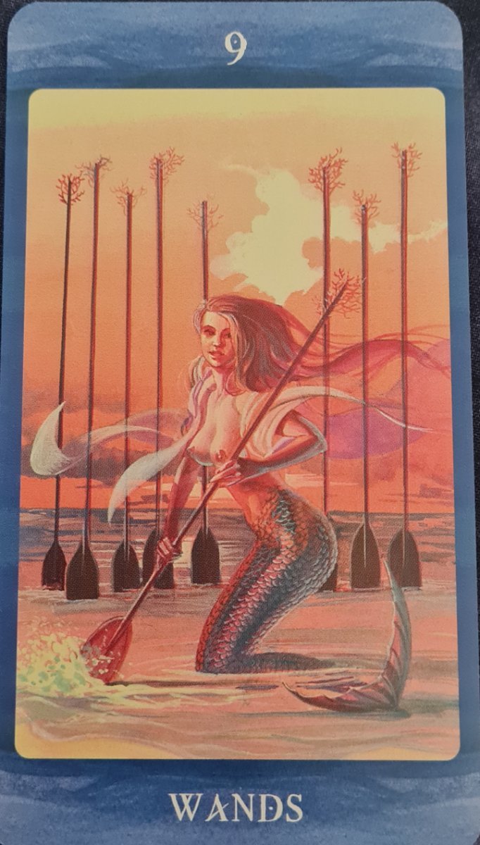 Hemera Posted September 26, 2024 Posted September 26, 2024 (edited) Mermaid tarot Day 3 Nine of Oars (Wands) Nine of Wands is just about a perfect card for today. All the traditional meanings apply to some extent: the need to heal before moving on, standing on one's last legs.. and whatnot. So the deck offered me a good card for today, *except* that looking closely at this picture, none of this comes through here in this particular card. This pointy breasted beauty is not in need of healing. She makes me think that she's looking for a challenge or perhaps she is gloating over all the oars she has managed to gather. She is neither tired nor worried. So I'm not sure what to make of today's card. It was spot on, and yet it wasn't. Well, four more days/cards to pull. Edited September 26, 2024 by Hemera