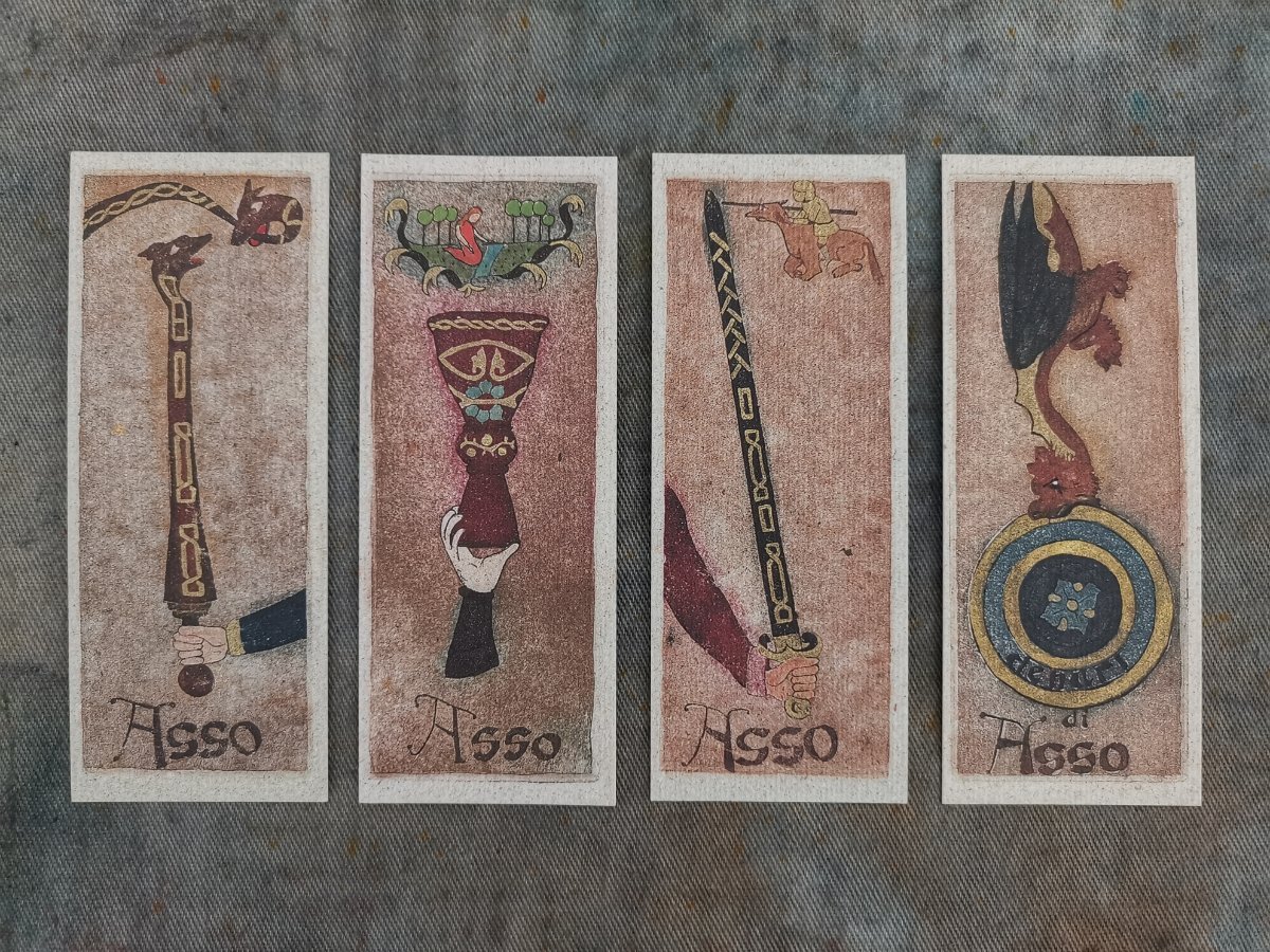 Ferrea Posted September 26, 2024 Posted September 26, 2024 The idea to sign up for this week came on Monday when I did a reading with this deck. The base card was the Ace of Wands, and it cracked me up when I looked at it closely. What is happening there? A stick with elaborate geometric painting, or possibly inlaid work, is held up by an anonymous hand. At the top of this stick is an animal head—I'd say a greyhound. Its mouth is open as if in surprise—understandably! From the left, a similar "stick" comes into the picture. Same colour, different ornaments, almost identical head, but this one is bending its neck to bite into its own neck. The second greyhound head's facial expression appears provocative to me, or playfully aggressive. "Let me see what you can do!" Below, I'll post all the aces. What they have in common, to me, is that the imagery negates the notion of singularity. As soon as you raise your sword, someone will be happy to go up against it. An impulse that is matched and challenged. A sentiment embedded in experience, an opportunity being grabbed. Just my initial associations. The Asso de Denari brought the final line of a poem by E. E. Cummings to mind: And set my teeth in the silver of the moon. [read the full poem here] It's so inspiring to look at these cards!