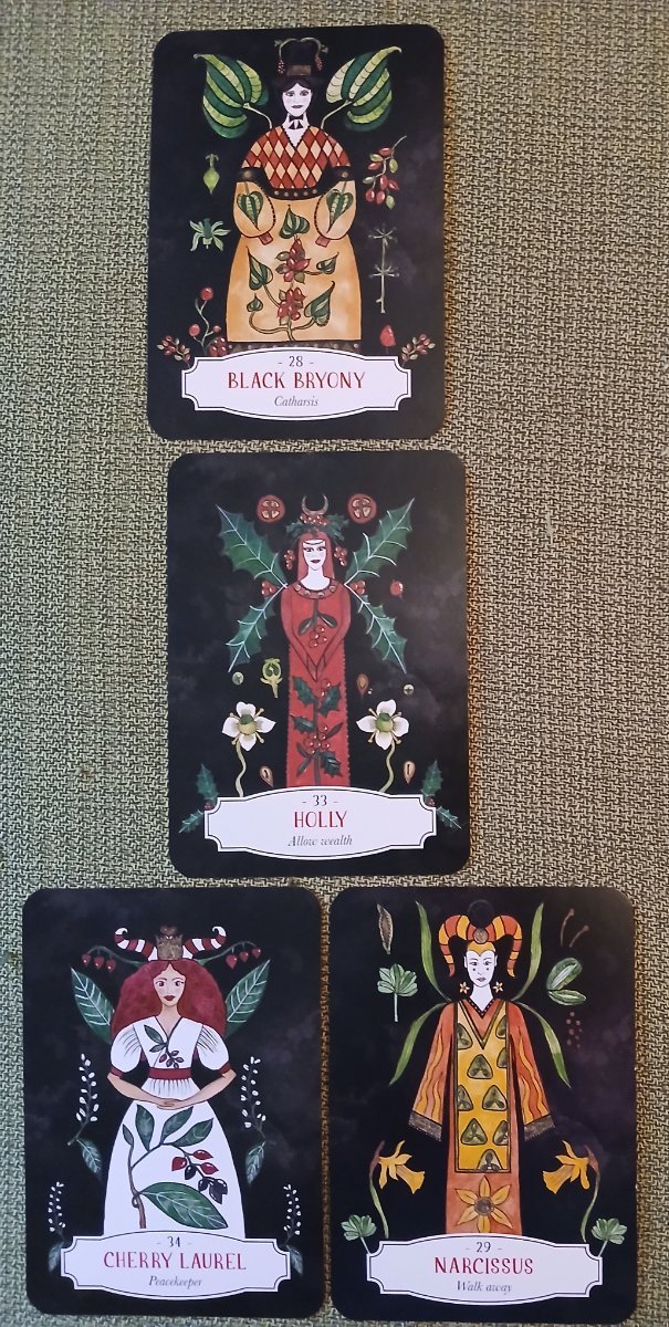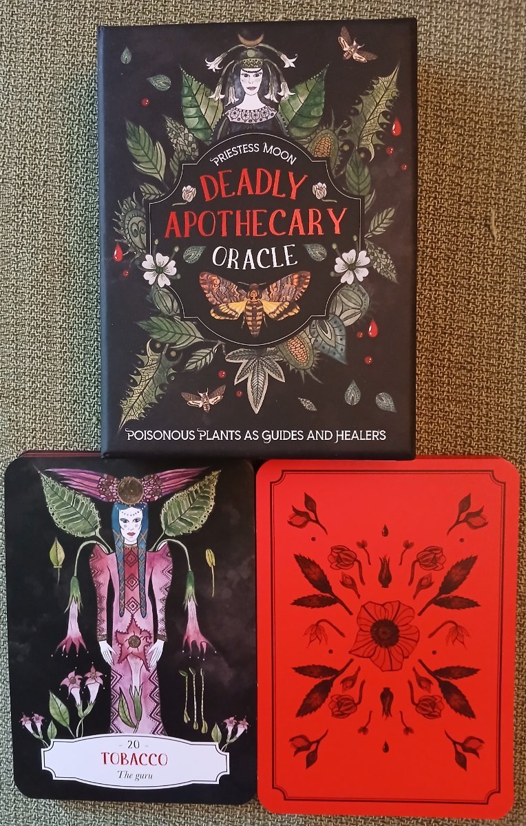 Rachelcat Posted September 23, 2024 Posted September 23, 2024 Hi all! Another good group this week! Another week, another new deck for me! (It's a sickness at this point.) This week will be Deadly Apothecary Oracle: Poisonous Plants as Guides and Healers, author and artist Priestess Moon, Rockpool. (She’s also the creator of the quirky Enchanted Unicorn Oracle and the related Making Magick mini cards.) 36 numbered cards with plant names and keywords. 4 of the cards are mushrooms, which technically aren’t plants but fungi (different scientific kingdom). It also includes some common plants/flowers that I didn’t know are poisonous, along with cannabis and tobacco. The illustrations personify the plants as women. I usually avoid a-woman-on-each-card-portraying-a-keyword decks, but the quirky art makes this deck an exception. Background of cards is black. Backs and edges are red for danger. Booklet has plant info, including traditional, medicinal, and magical uses, and then two sections: “The Poison” describing a negative personality or life experience and “The Antidote” with the positive side of that and advice for it. Let’s give it a try with the shortened interview. What is your strength? Narcissus, Walk away Bulbs are poisonous, but are being tested as a possible Alzheimer’s treatment. The best way to deal with a narcissist is to walk away. The deck gives practical advice for dealing with toxic behaviors (as well as plants). Your weakness? Cherry laurel, Peacekeeper The leaves are the poisonous part. This is about always giving in to keep the peace no matter what and how sometimes you have to stand up for yourself instead. The advice might be too general. Sometimes it’s better to keep the peace than fight! What can I learn from you? Holly, Allow wealth The berries are poisonous! As you know, evergreen holly is brought inside at Yule to symbolize/encourage luck and prosperity in the darkest part of the year. The booklet talks about envy of others’ prosperity and criticizing how others use their finances. It’s easy to turn that around by being rejoicing in our own good fortune and that of others. The lesson is we can enjoy life with possessions and treats without endangering our prosperity. I like that lesson! What will be the outcome of our work together? Black bryony, Catharsis Roots were used topically to treat bruises and to purge negative energy. Booklet says it’s about dealing with anger properly: express it, emphasize boundaries, and don’t let it build up and cause overreaction or other issues. The deck’s focus on negative energy and how to deal with it will be a help to me. Interesting! We’ll see how it goes this week!