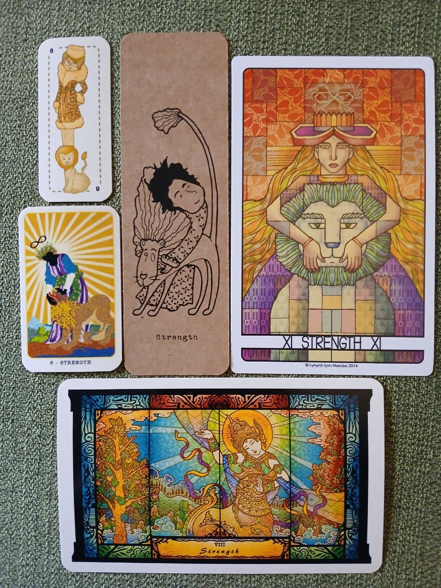 Rachelcat Posted October 7, 2024 Posted October 7, 2024 Hello, my deck loving friends! I’m going to try something a little different this week. I’m going to use the Lynyrd-Jym Marquez Narciso, Parluman Studio, majors-only decks that I have all together (5 of them): Tarot of the Curious East, a landscape deck featuring various Asian art styles Nota Bene Tarot Bookmarks, whimsical elongated monotone drawings Tarot of PsyChicks, possibly a prototype of Ly’s US Games-published Vanessa Tarot Tarot Resom ("Moser" backwards), in the Wiener Secession style of Ditha Moser Tarot 2-12-1-3-11 (numerological spelling of “black”), a RWS clone with the human figures in black I’m pretty sure he gifted me the minis (and the bookmarks?) when I purchased the Curious East many years ago. I’m also pretty sure he hand-made the box and all the cool envelopes. So I’m going to draw one major a day and look at all 5 variations as we go. First question: how will this deck of the week plan work out? Strength (Some are 8, some are 11, some are not numbered, but all are lions!) This way of using the same card from each deck will show the decks’ strengths. And they will provide powerful readings even though they are arty and/or whimsical.