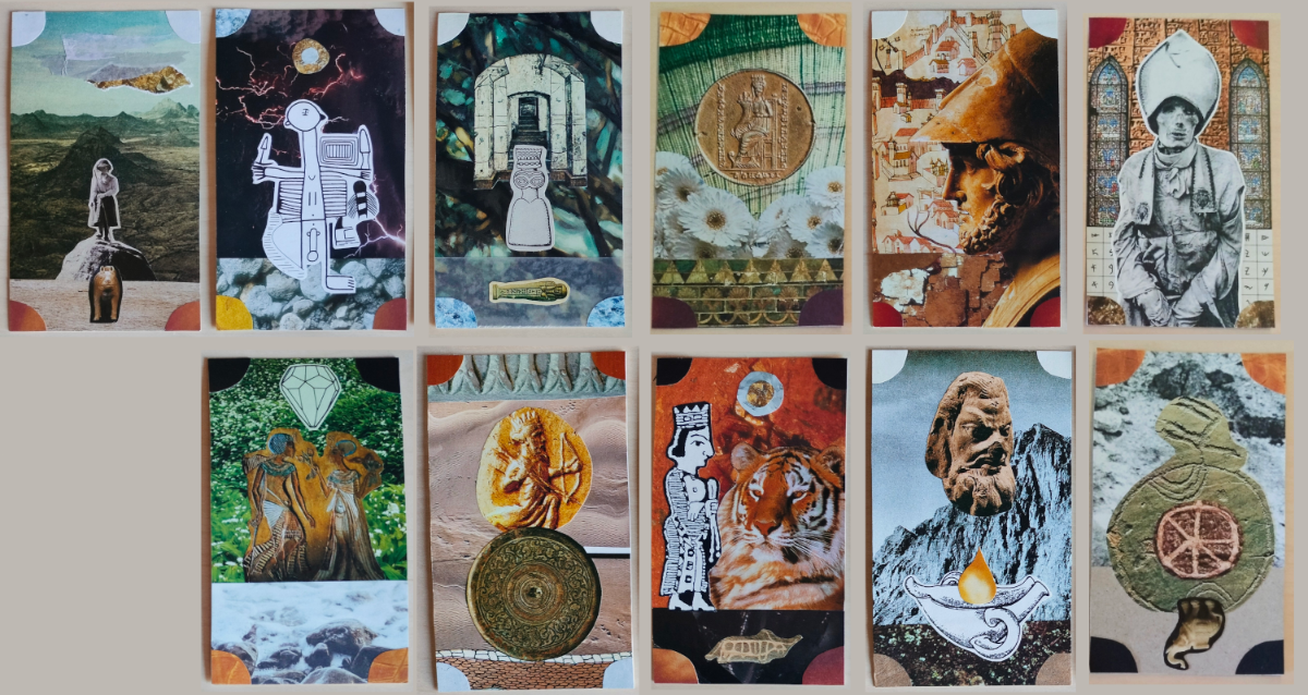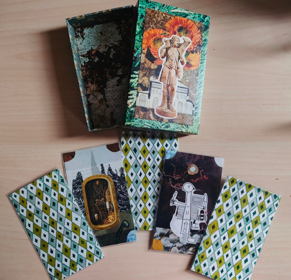 GreyBug Posted November 24, 2024 Posted November 24, 2024 (edited) My third creation - another all-majors deck, this time executed in collage. I like the feel of the images, they carry a weight of human history and culture. I haven't numbered or named them but I frankenstein-ed a picture of them all in order, so you can more easily see what's what (if you're not fussy about your Strength and Justice cards). I'm not entirely sure if that's who it is, but the statue on the box lid made me think of Pastoral Apollo, who I associate with his oracular domain. Edited November 24, 2024 by GreyBug