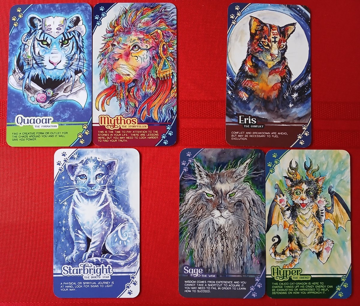 Rachelcat Posted January 13, 2025 Posted January 13, 2025 Hi, fire cat! Thanks as always! Tarot of the Drowning World looks so enticingly mysterious and yet so floral! Looking forward to seeing more! This week for me will be Cosmic Cats Oracle and Mythical Cats Oracle Deck by RareDragons.com from Kickstarter. They are fantasy cats created by the artist, with a name, “the something,” and message on each. Cosmic Cats is the expansion deck, with cats representing planets, asteroids, and other spacey things. I’m going to shuffle them together as a 110-card deck. (The backs are different, but it will still work.) The set also has spread “cores,” cards that have 6 or 8 spread positions where the main cards are to be placed. You’ll see how they work when I use them this week. In the meantime, interview! What is your most important characteristic? Starbright, the North Star The deck can take me on a journey. What is your strength? Mythos, the Storyteller (this is the theme and backs for the Mythic Cats.) It tells stories in a fun but reflective way. Your weakness? Quaoar, the Formation But sometimes it can be a bit dense. It’s an oracle without form, not a tarot. (I’m going to have to disagree that it doesn’t have form. Because I think the core cards give the whole thing some organization.) What can I learn from you? Hyper, the Energy I know about hyper cats! (But not at the moment. My kitty is old and sleepy.) I can learn about raising my energy and how to use it properly. Because I’m old and sleepy too! How can I learn it? Sage, the Wise Ah, the dichotomy. I can learn about energy only when I have the wisdom of age to know how much it’s needed when I don’t have it. What will be the outcome of our work together? Eris, the Conflict We’ll disagree, but that will lead to more understanding for me. We’ll see!