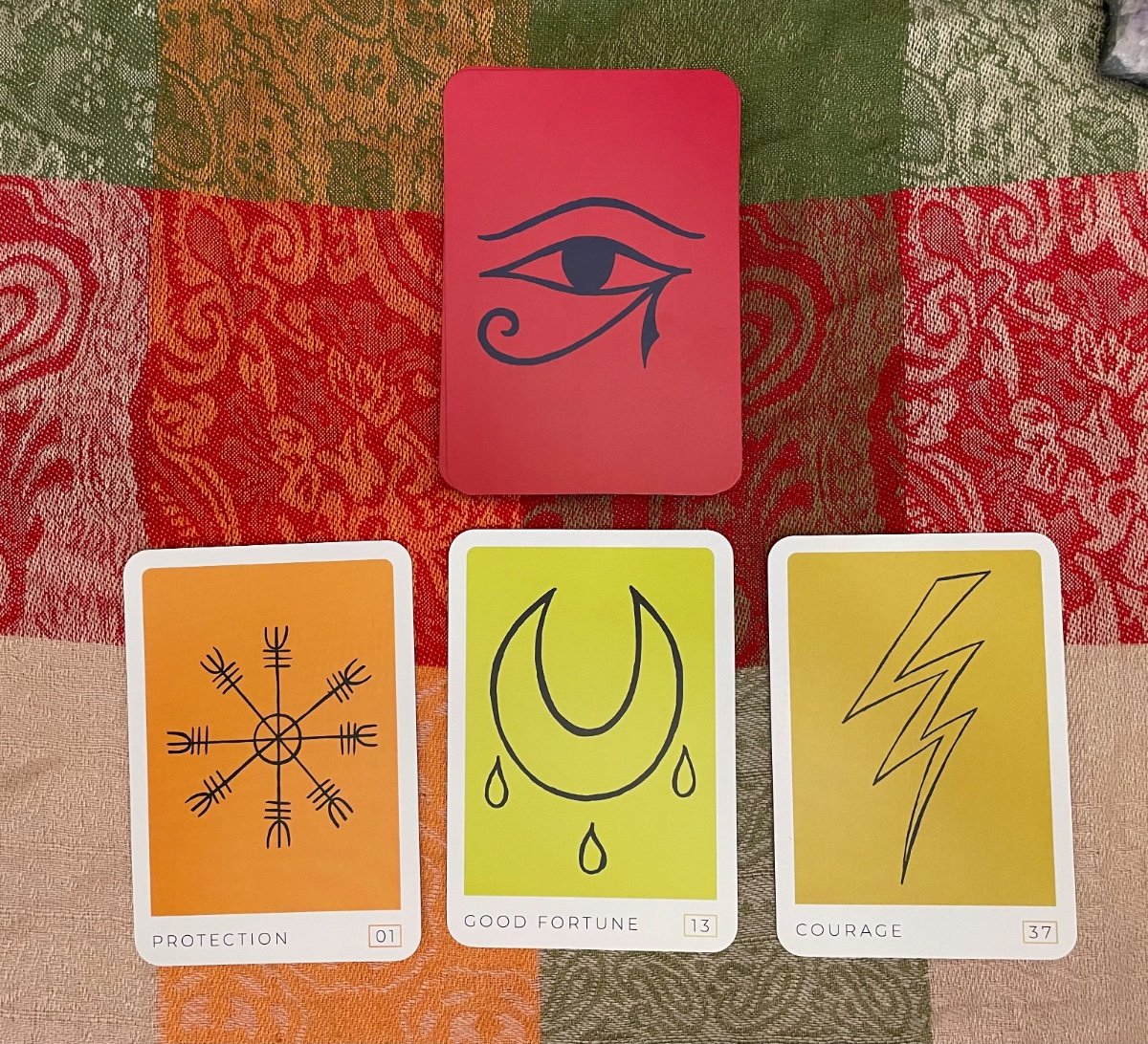 PrettyMama Posted February 3, 2025 Posted February 3, 2025 Hello, @fire cat pickles! Thought I might dip my toes in the pool.😊 This week I’m taking a closer look at my Sacred Symbols Oracle deck by Marcella Kroll. I’ve had it a couple of months, but haven’t worked with it as much as I’d like. This is a 50-card deck. The beauty of this deck lays in it’s simplicity — both in design and symbolism. Intuitively, it’s not difficult to read. Yet there seems to be such depth that comes across in the readings. This reading is a prime example. I decided to keep this reading straightforward and simply asked for a message from my spirit guides. No fixed positions. A hand over hand shuffle, a single cut and a three card pull. Protection - Helm of Awe This is a Norse Viking rune. It was often used when petitioning the gods for protection in battle. Good Fortune - Blessings A pagan magical symbol for blessings and good fortune. Courage - Lightning The lightning bolt is a symbol of courage. It was inspired by the fictional comic book character Shazam, as well as a real-life person from the creator’s life. The message is one of safety in all matters of mind, body and spirit. Good Fortune hints at blessings and a good time for manifestation. Courage points to a frame of mind when confronting difficulties. Overall, this deck has a nice vibe. It’s easy to shuffle and intuitively easy to read. I can this fitting well within my divination routine. It’s a keeper.❤️
