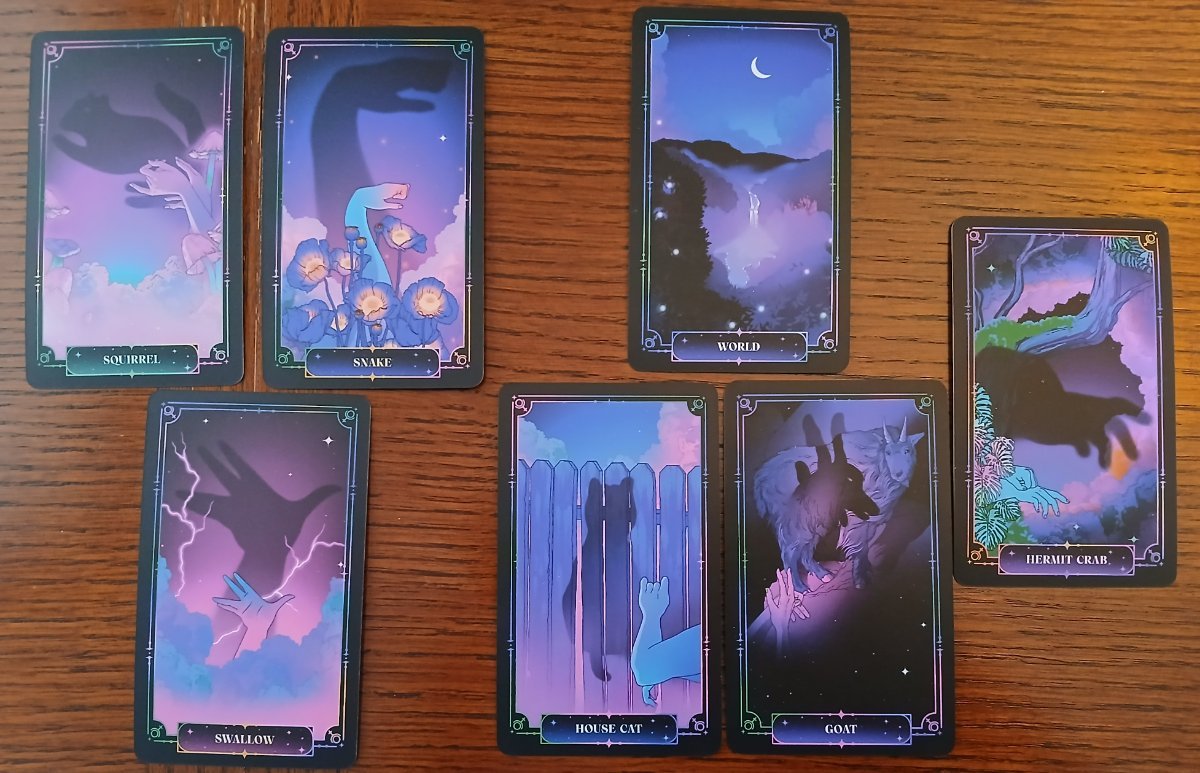Rachelcat Posted February 3, 2025 Posted February 3, 2025 Hi, everyone! Another new deck to check out! This week will be Oracle of Pluto: A 55-Card Exploration of the Undiscovered Self. I saw it on a YouTube video and was intrigued. It’s mostly an animal deck (with a few non-animal cards), but the animal illustrations are made as shadow puppets, bringing out the idea of the shadow as the unknown, along with Pluto as “lord of the underworld.” Oh, and it features human hands, just like my previous deck! Looking forward to seeing some unknown things, and maybe I’ll learn how to make shadow animals! (BTW, it has a very annoying wraparound box. I might have to resort to a bag for this one.) Time for the interview! The booklet recommends using the shadow card (bottom card of the deck), so I’m going to do that in all the readings. I think. Today I’ll try without using the booklet. What is your most important characteristic? Swallow Swallows fly very fast and in a way that’s more akin to bat flight than that of other birds. The lightning also suggests fast and sudden. The deck isn’t just another animal deck because it approaches it in a very different way. What is your strength? Snake Again, it’s not a regular deck. A snake symbolizes rebirth and wisdom. The deck is an animal deck reborn and has its own wisdom to share. Your weakness? Squirrel It might be a bit frenetic, maybe hard to get hold of, and selfish. Random characteristics I associate with squirrels. What can I learn from you? Goat How to be the greatest of all time? 😊 I can learn how to either climb to the heights or really enjoy myself in a way that seems risqué but is really wholesome. How can I learn it? House cat Oh, similar! Cats are a combination of mystery, violence, and clowning. And also symbolize fierce protection. So I can learn ambition or indulgence by being catlike: self-indulgent, self-cleaning, fierce, and a homebody. And sometimes a clown. I’ll try! What will be the outcome of our work together? World One of the non-animal cards, I think the last card in its own order. The deck will really help me see things in a different way. And, as I interpreted the tarot World in the last reading, I’ll see how we’re all connected and in this together, humans, animals, and the natural world alike. Shadow: Hermit crab What I don’t know about all this is that even while I’m learning all this, I’ll remain my real introverted self. Well, that’s not about to change, so I’ll take it!