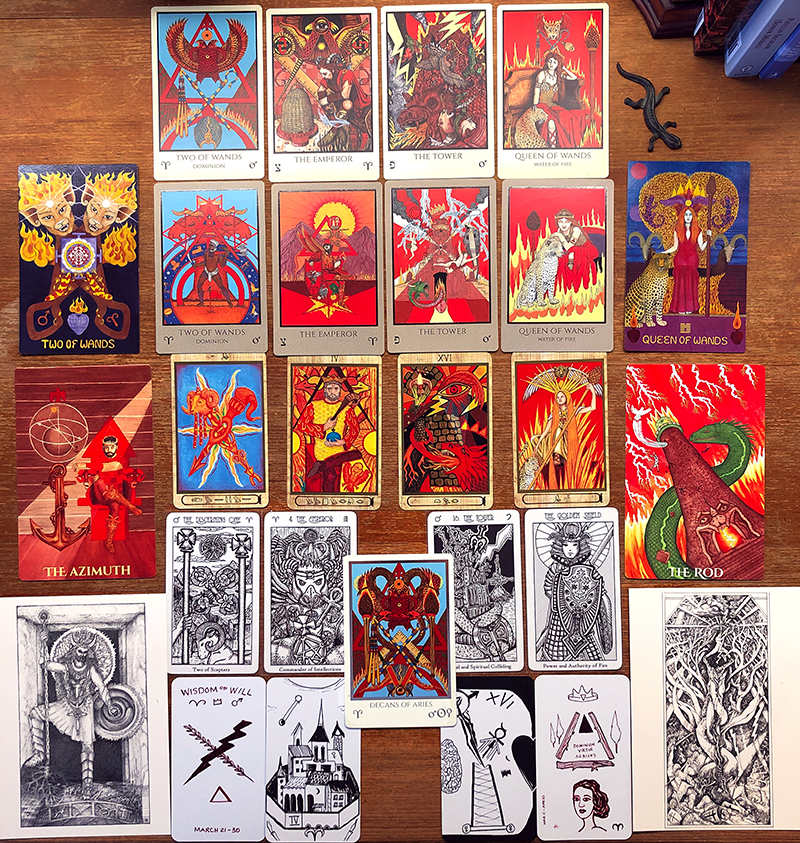 Ferrea Posted March 27 Posted March 27 7 hours ago, Rose Lalonde said: ...and I laid out the cards so I can see them on my desk through the 30th. Very red, with the exception of the b&w cards. Although generally the 3 of Wands is even more red, since the background is red too instead of blue. Like the 2 is the raw fuel while the 3 is the extra burn you get when you've put the fuel inside a furnace. (Stolen from Dione Fortune) How could I forget the bullet stopping cuffs?! Which decks are those colourful ones on the outer edge of your tableau?