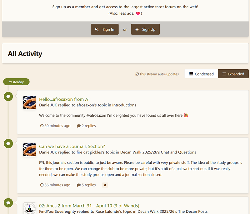 fire cat pickles Posted April 1 Posted April 1 The decans section is nice for general discussion and questions. But can we have a journals section/subforum? I am thinking of doing a deep dive into the Book of Thoth with the Liber T as a study deck (and the Oracle of the Radiant Sun paired with it) and I wouldn't mind having a place to keep my notes. I don't want to clog up the discussion area with it, and I don't necessarily want to put it in my other Journal or the Card-a-Day forums either.