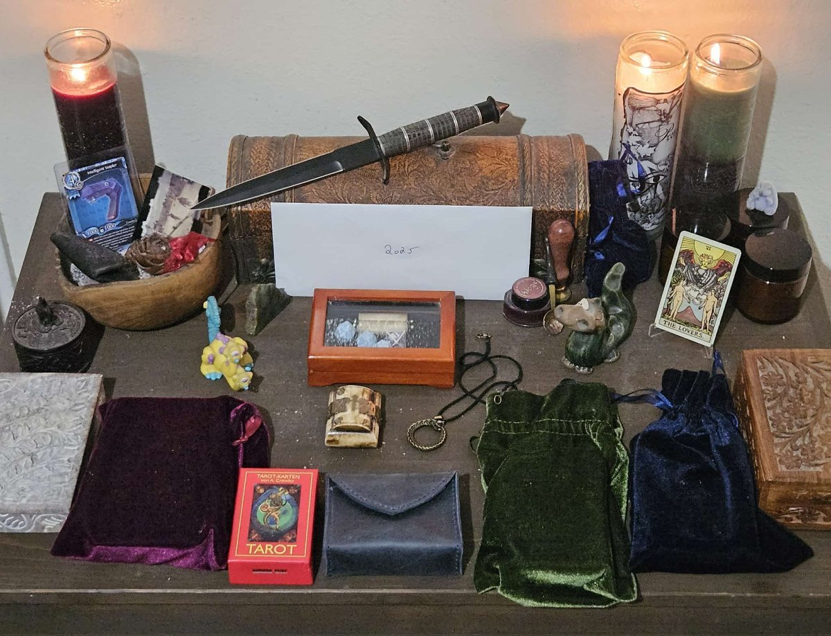Wyrdkiss Posted September 29 Posted September 29 (edited) It seems I have three spaces to share with you: A.) My Focus / Altar B.) My tarot Collection Space ( cabinet) C.) My reading area for myself and clients. All I can post tonight is my Focus, which is in dire need of dusting. I do not read here, as this wooden chest is on the floor and would be quite uncomfortable. This is where things of importance are kept, my intentions documented, and a few needed tools exist. Normally my Athame / working dagger is in the wine box, but is out for completions sake. The decks in the front row in velvet, boxes and leather case are all extra duplicates. I use them to display a card or two of importance when I've done reading that I need to keep close in my headspace. Purely display decks, I'm a nerd that way. Yet they can be viewed for a long while, without interrupting my reading packs. Left to right they are: Tarot of Shadows, Thoth (German pressing), RWS pocket (Centennial), Tarot of the Secret Forest, and the Darkness of Light tarot. Not pictured but awaiting a case or proper holder is a Deviant Moon my son gave me. All of the items are very personal; some gifted, found or made, and the Ouroboros necklace along with the Athame are favorites. Quite a few trinkets and elements are tucked away in all the containers as well. I have more trading card game display stands if I wish to prop up more than one tarot card at a time. I'm so glad I revisited this thread, as It has brought back some focus and reflection to, well my Focus. Edited September 29 by Wyrdkiss