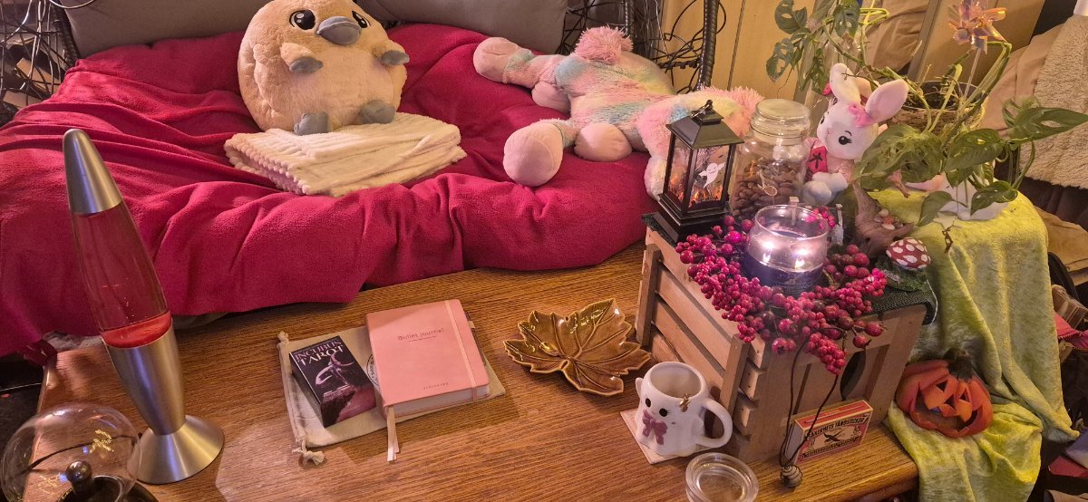 Fairy666tale Posted October 26 Posted October 26 Seeing as I can share images now: here's my (very random) space. It's essentially a little reading/movie spot in my room (I sit on the floor across of the couch when I do readings), but my deck and the notebook are always there. Right now, there is also Halloween/autumn decoration. The jar of (old inedible) almonds is for holding incense. And the stones in the back are on a cool piece of wood that I once found. The plushies, lava lamp and lightning lamp (don't know what it's called) are just there because I like them and had no other place to put them...