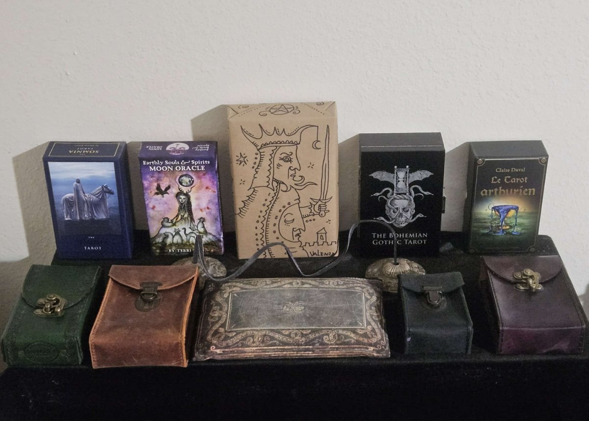 Wyrdkiss Posted October 2 Posted October 2 OK, nothing fancy here, but next up is the top of a book shelf behind my reading table. These are my client decks, my working rotations. They are all in the pouches / tarot cases. disregard the deck boxes propped up; they are just nice (and empty) boxes I have on display. All of those decks are for my personal use, and are in cases / velvet bags, etc. The hand-illustrated and signed Deviant Moon is not opened of course! Left --> Right decks are Darkness of Light, Llewellyn Tarot ( I may be using this dually for myself and others, we'll see). Center is the Deck of the Bastard with Keywords from TarotbySeven. The small case is a trimmed travel Thoth, and the last is my client Thoth full size. I also have a RWS, not pictured, that I may use with clients. I like the tradition of the RWS, but I'm hesitant as many people, myself included, just find the pack, "ok." books on the shelf are all easy-to-grab tarot / magick type selections. Do any of you separate out the decks you read for others from the ones you use yourself?